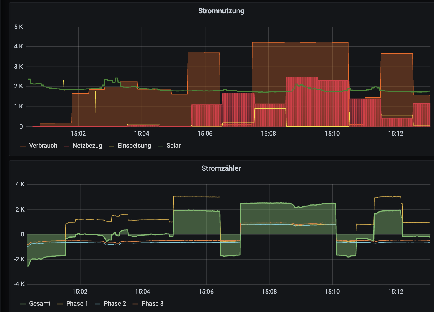 So, die Variante im Beitrag eins höher ist jetzt zumindest erfolgreich schnellgetestet. Anbei der Testlauf aus Sicht meines Netzes mit aktuell ca. 1,9 kW PV-Überschuss: Ich habe den Überschuss um 2600 Watt "hochgemogelt". Dadurch ging die Ladung erst auf 16A. Anschließend habe ich die Wartezeit durch manuelles Setzen von ramdisk/uhcounter auf 470 verkürzt, die 3P-Umschaltung lief an und durch ohne den 16A-Vollgas-Boost. Danach habe ich die vermeintliche Einspeisung auf ca. 3,9 kW gesetzt und auch das Runterschalten simuliert. Zum Schluss habe ich den Überschuss wieder auf Real gestellt, sodass das Laden jetzt mit 7 A läuft.