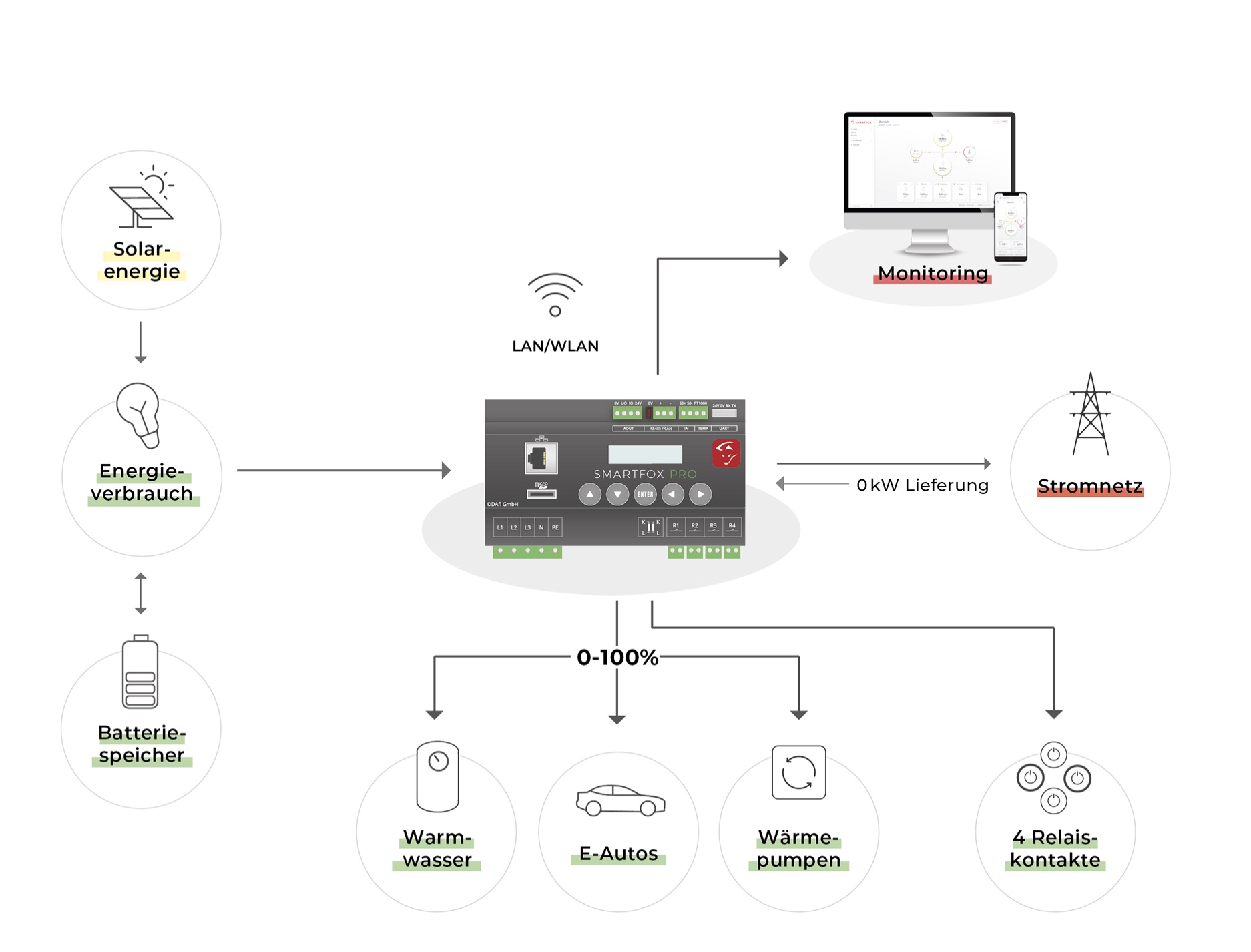 wird an den smartfox ein Zähler angeschlossen, der Einspeisung/Bezug selbstständig misst. Über ein paar Ausgänge wird dann 0-100% der Verbrauch gesteuert. In der Haustechnik sind das häufig PWM-Signale. Den Part der Überschussberechnung und das verbrauchen übernimmt algorithmisch schon die openWB. Jetzt ist nur die Frage, wie der Heizstab angesprochen wird. PWM? Dann müssten wir ein Modul suchen, was aus einem einfachen URL-Aufruf das passende PWM-Signal macht.