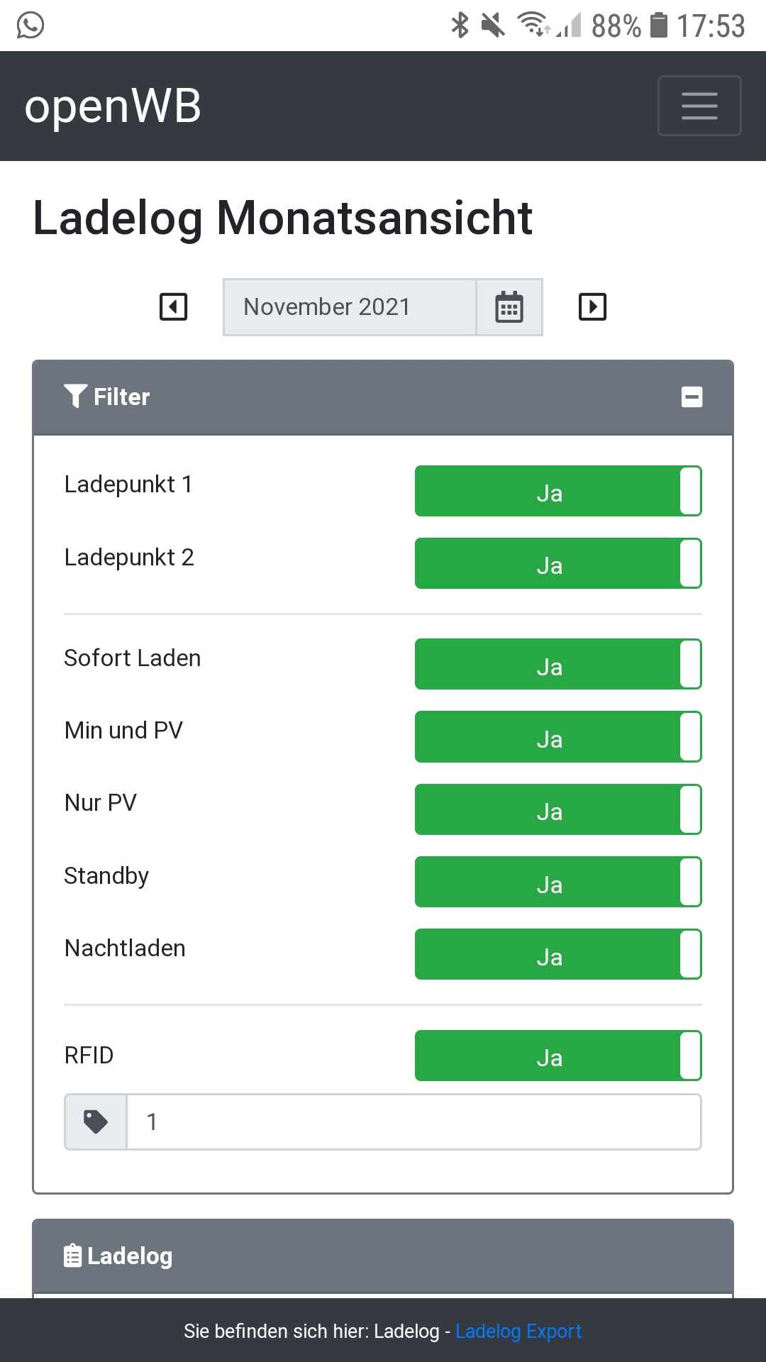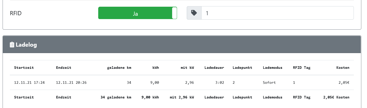 Im LadeLog kannst Du die RFID filtern, dann zeigt es im Log alle Ladungen nur für diesen Chip an: