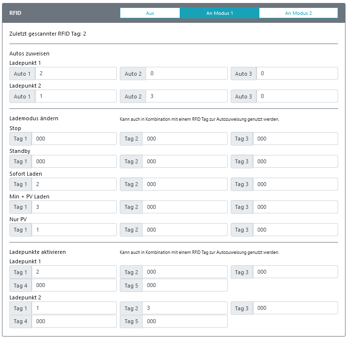Wenn ich jetzt zwei Autos an LP2 lade mit 6 verschiedenen Chip muss ich je Auto drei Chip mit Kommastelle eintragen weil sonst nicht genug Felder vorhanden wären. Ich werde es probieren sobald der RFID Leser da ist.