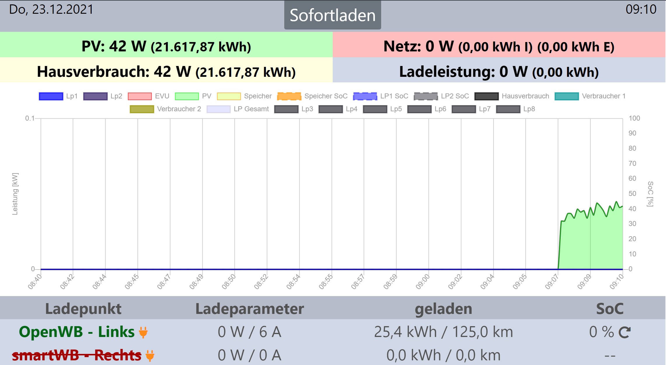 2021-12-23 09:41:58: Sofort ladung Ladepunkt 1 bei minimal A 6 Ladeleistung zu gering (LV1) at 284 sofortlademodus sofortlademodus.sh