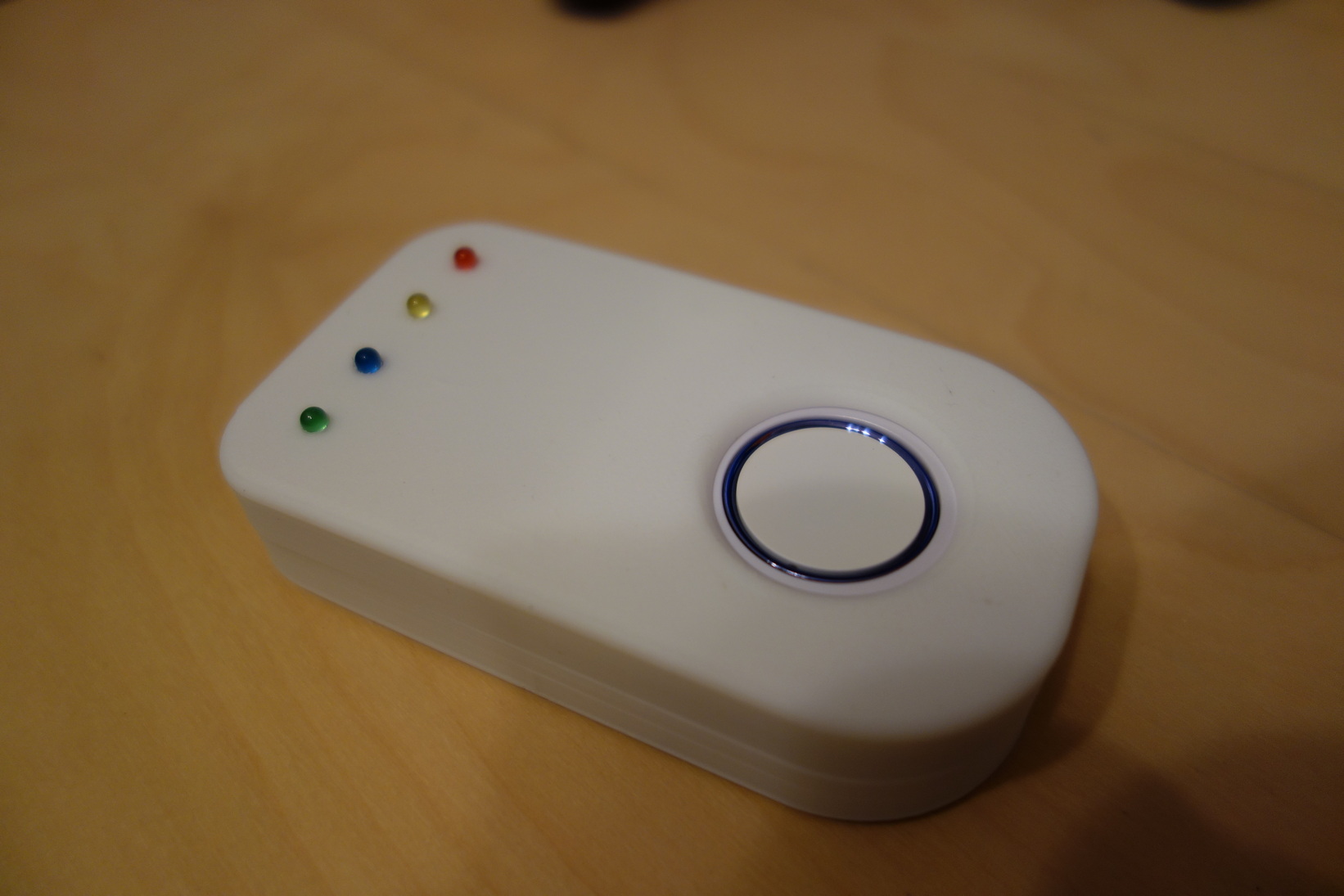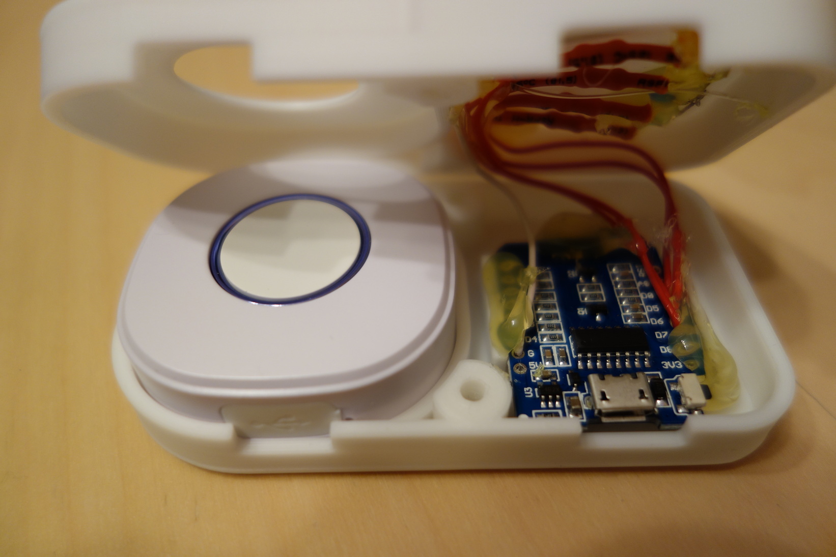 in dem der Button und ein Wemos D1 mini mit 4 LEDs Platz hat. Der Wemos holt sich die Daten (Ladestatus und Modus) per mqtt von der OpenWB.