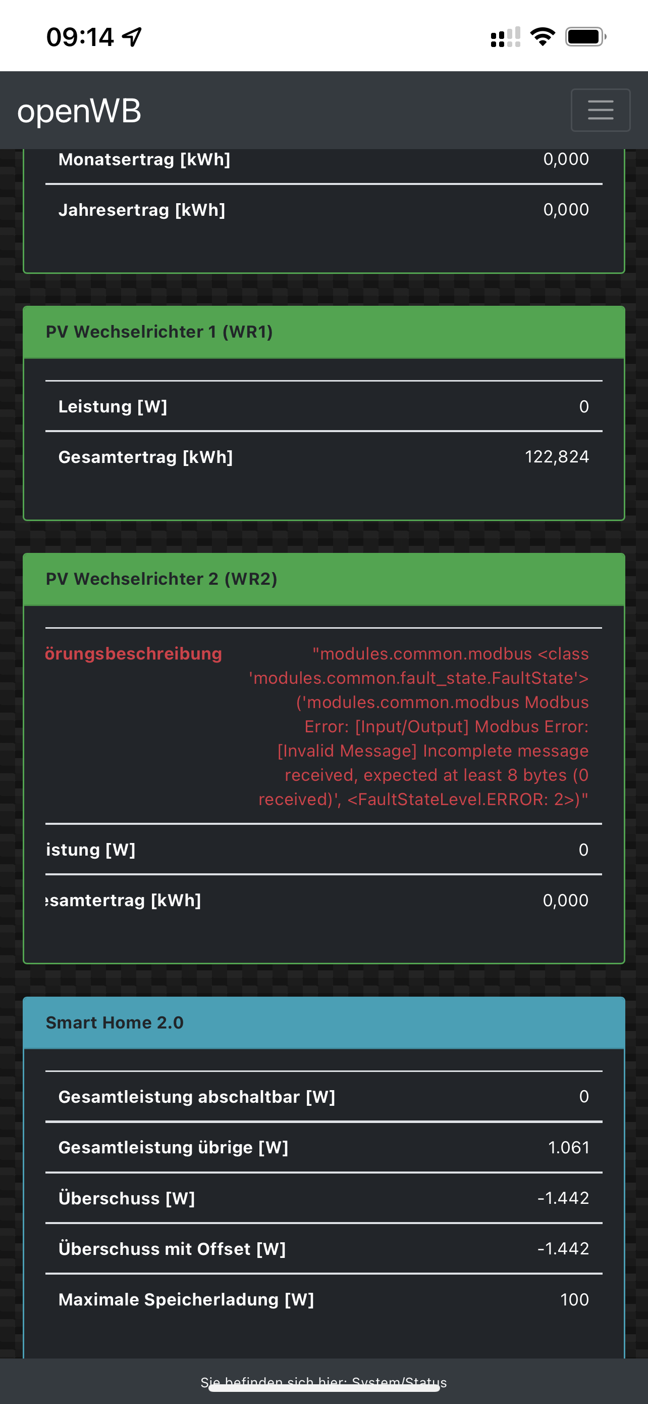 Ich habe heute morgen mal ein Update auf die neuste Nighly gemacht und seid dem läuft mein PV Kit aus dem Shop leider nicht mehr. Folgende Fehlermeldung steht unter Status: