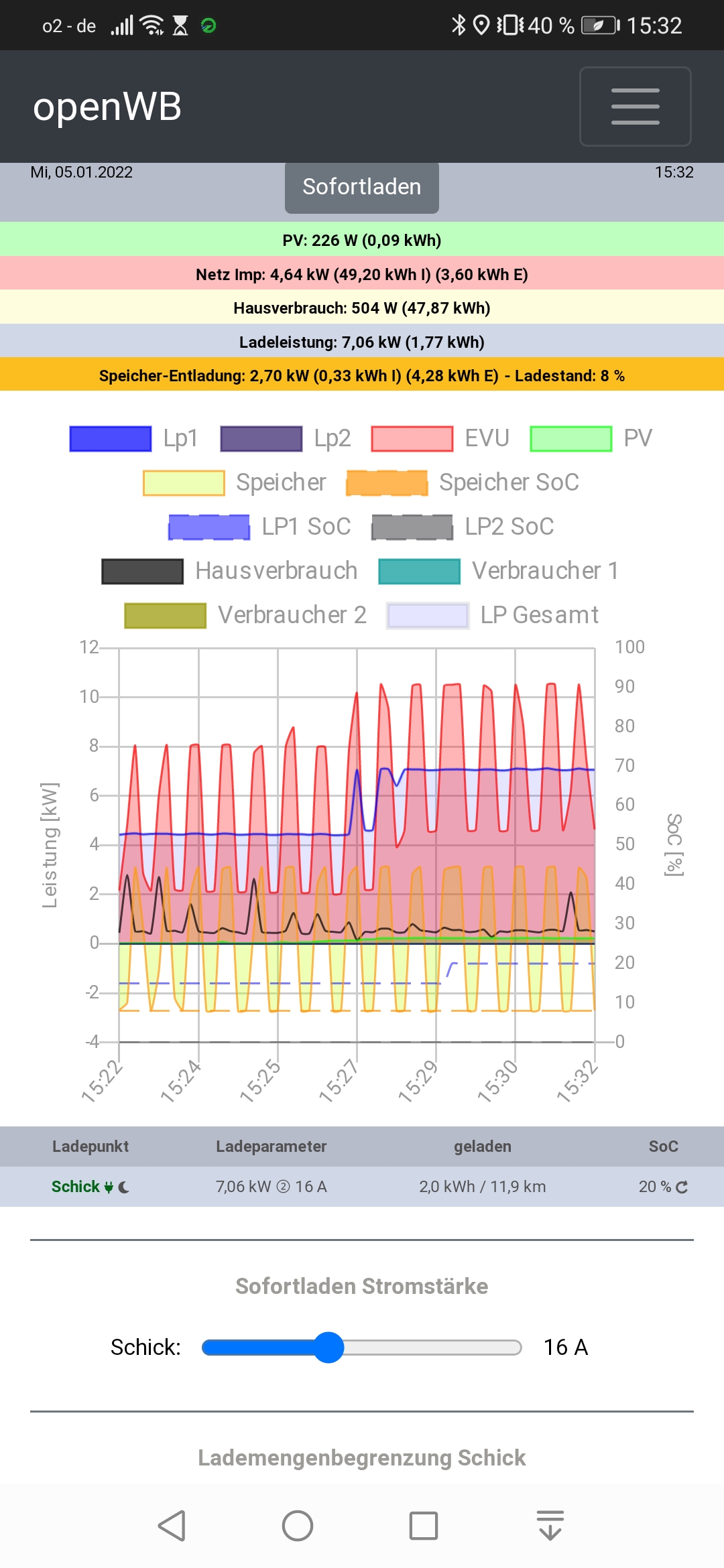 Inzwischen hängt der Hausakku an Victron Wechselrichtern und ich kann den SoC einstellen, der bei Netzbetrieb nicht unterschritten wird. Im Moment steht der Wert immer auf 50% um Reserven für Notstrombetrieb zu haben.