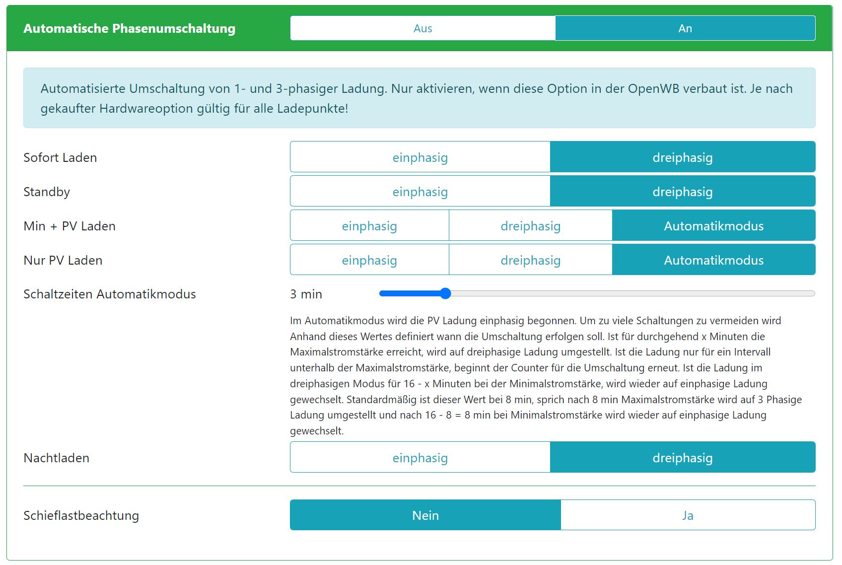 2. Problem: Der Ladepunkt 2 (externe OpenWB) lädt nur einphasig mit 3,4 kW und nicht dreiphasig. Weder im PV, noch im Sofortladenmodus, obwohl alles auf 3-Phasig konfiguriert ist. Hat anfangs (vor aktivierter Phasenumschaltung) auf jeden Fall mal dreiphasig funktioniert wenn ich mich recht erinnere.