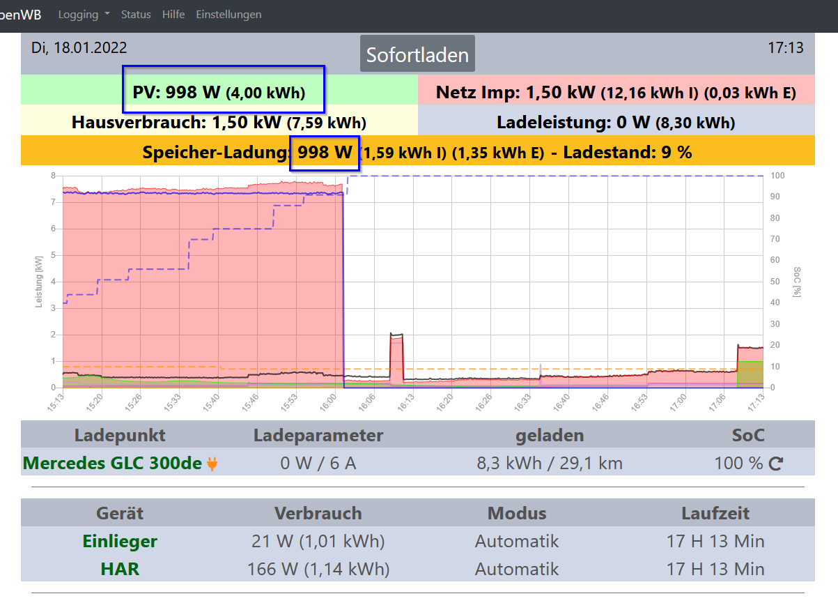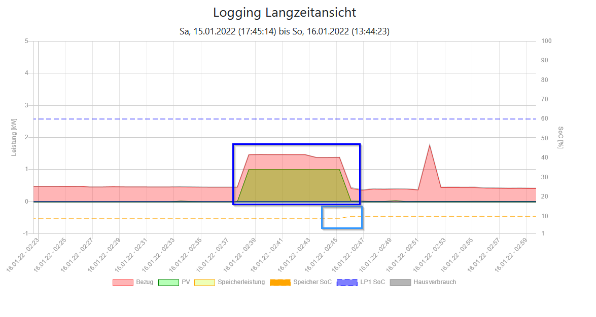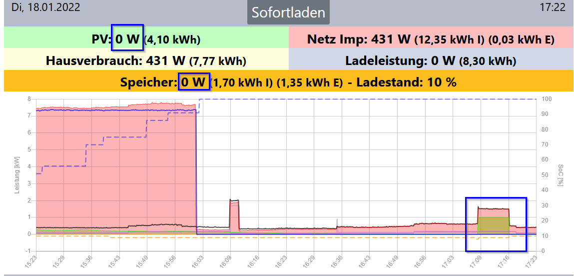Heute morgen hat das PV-System den Batteriespeicher wegen zu wenigem SOC mit Energie vom EVU laden müssen.