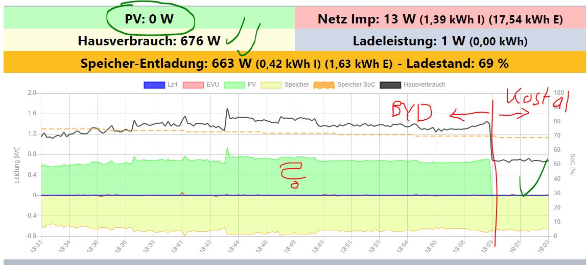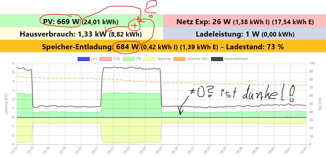 Bei Entladung der stationären Batterie scheint ein ähnlicher Wert vom Wechselrichter darauf addiert zu werden um den aktuellen Hausverbrauch zu berechnen. Und nein - es ist draußen Dunkel - vom Dach kommt als keine PV Leistung :roll: