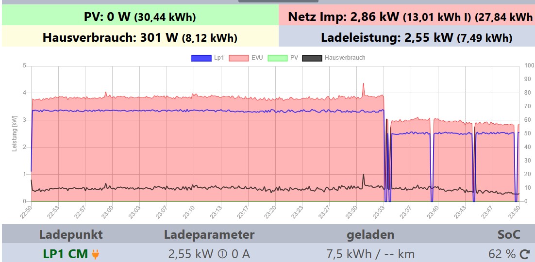 Danach dann wieder das Ein/Ausschalten - immer wieder mit diesen 2,5kW. Hier war die Ladeleistung anfangs ca. 3,3kW (16A) und beim Fehler dann diese ominösen 2,5kW. Gleiches Bild wie beim PV-Modus, nur dass da eben vorher 1,8kW waren und beim Fehler 2,5kW. Also scheint der Fehler nicht nur bei PV vorhanden zu sein. Hier noch das Bild wie es aussah: