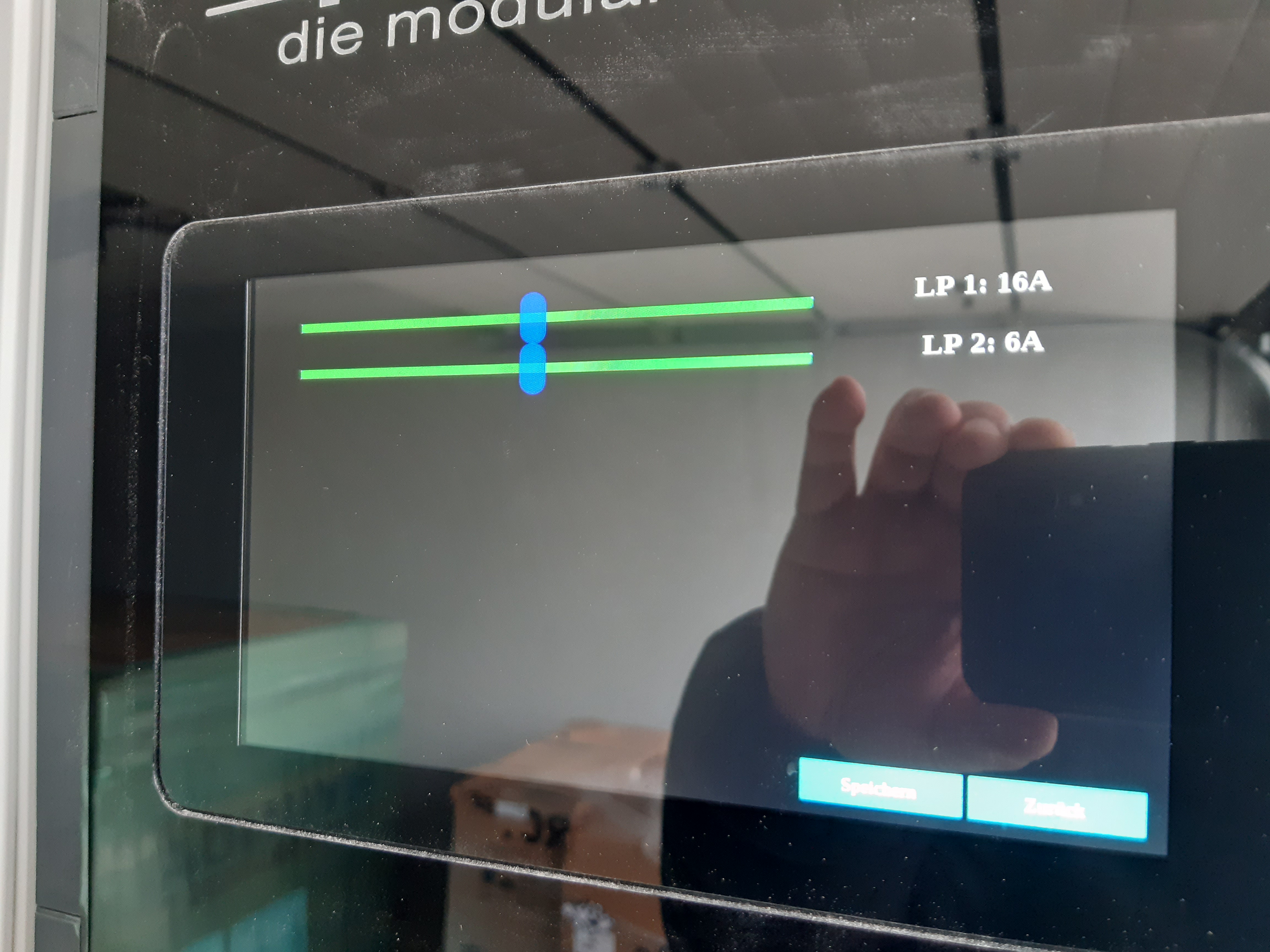 1) Geht man auf Ladestrom, so erscheinen zwei Schieberegler. LP1 steht bei 16A, LP2 steht bei 6A (übrigens zwischen Einheit und Zahl gehört immer ein Leerzeichen!). Dennoch sind beide Schieberegler mittig.