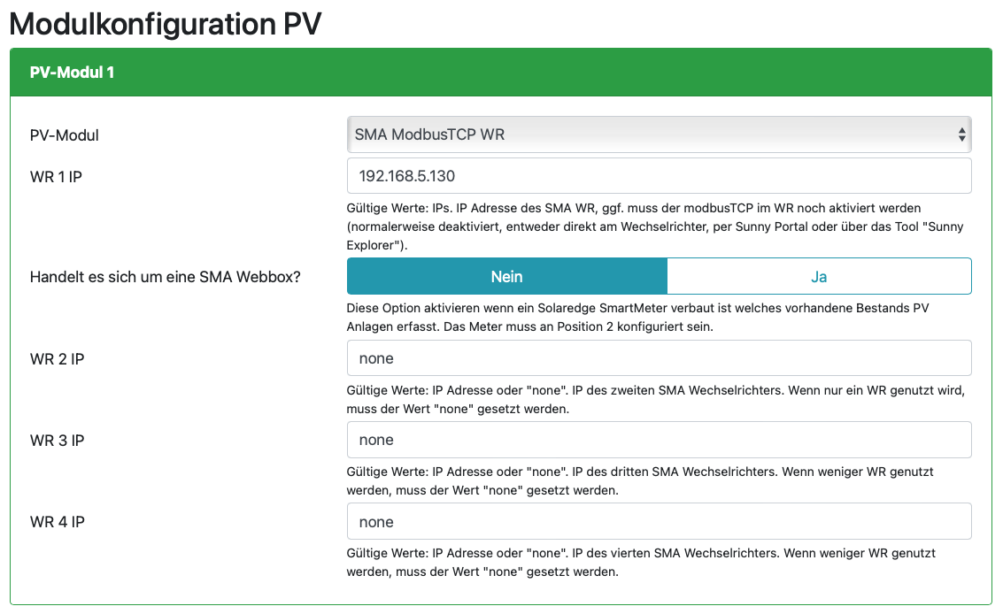 Ich habe das ursprünglich beschriebene Problem, allerdings bei einer frisch eingerichteten openWB series2 standard+. Bei mir sind zwei SMA-PV-Wechselrichter (STP8.0-3AV-40, STP 10000TL-20) + SMA Batteriwechselrichter (SBS5.0-10 323) im Netzwerk. Modbus (TCP) ist bei beiden PV-WR aktiviert. Über Radzio! sind auch beide erreichbar. Die Modulkonfiguration PV in der openWB führe ich wie überall beschrieben durch (PV-Modul 1: SMA ModbusTCP WR + statische IP des ersten PV-WR, PV-Modul 2: SMA Wechselrichter + statische IP des zweiten PV-WR). Letzteres habe ich auch in verschiedenen Variationen getestet (vertauschen der WR, auch mal nur einen WR).