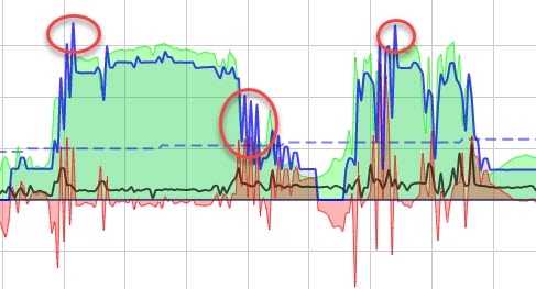 Man sieht wunderbar, wie konstant Sonne da ist (grüner Bereich), und den openWB dennoch plötzlich anfängt, "zu spinnen" und hin und her regelt.