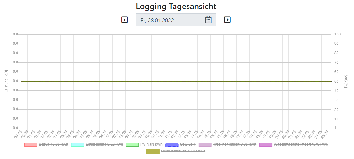 Wenn ich unter "Logging" => "Graph" => "Tag" gehe, wird mir für die PV kein Verlauf angezeigt und in der Legende ist "PV NaN" ausgegeben