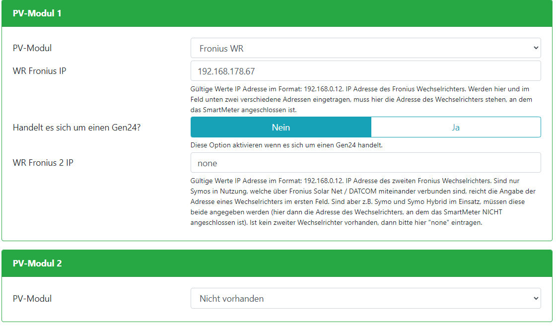 Ich habe es so verstanden, dass man beim EVU Modul "Fronius Energy Meter" nochmal die IP Adresse des Fronius WR angibt. Oder habe ich es missverstanden?