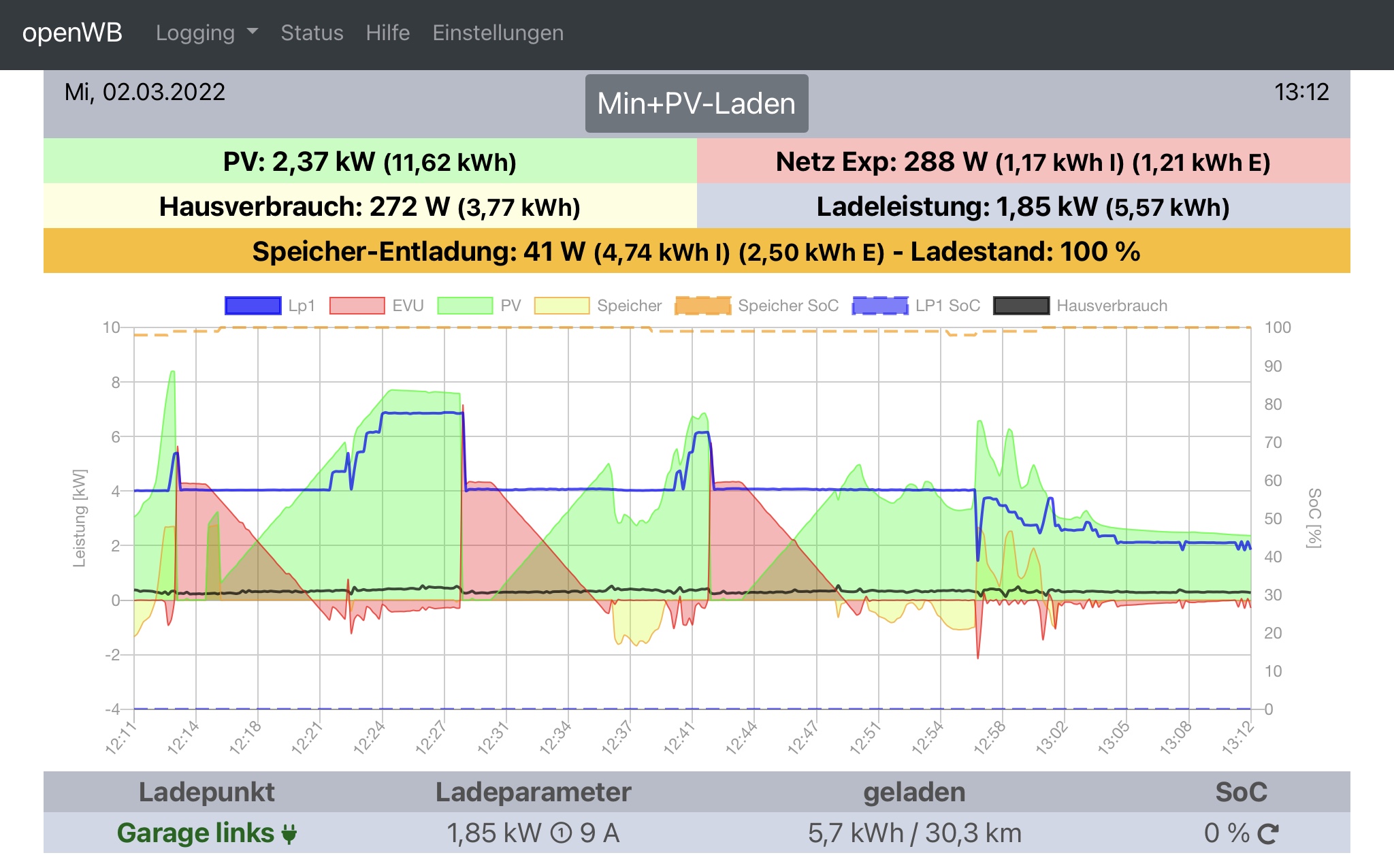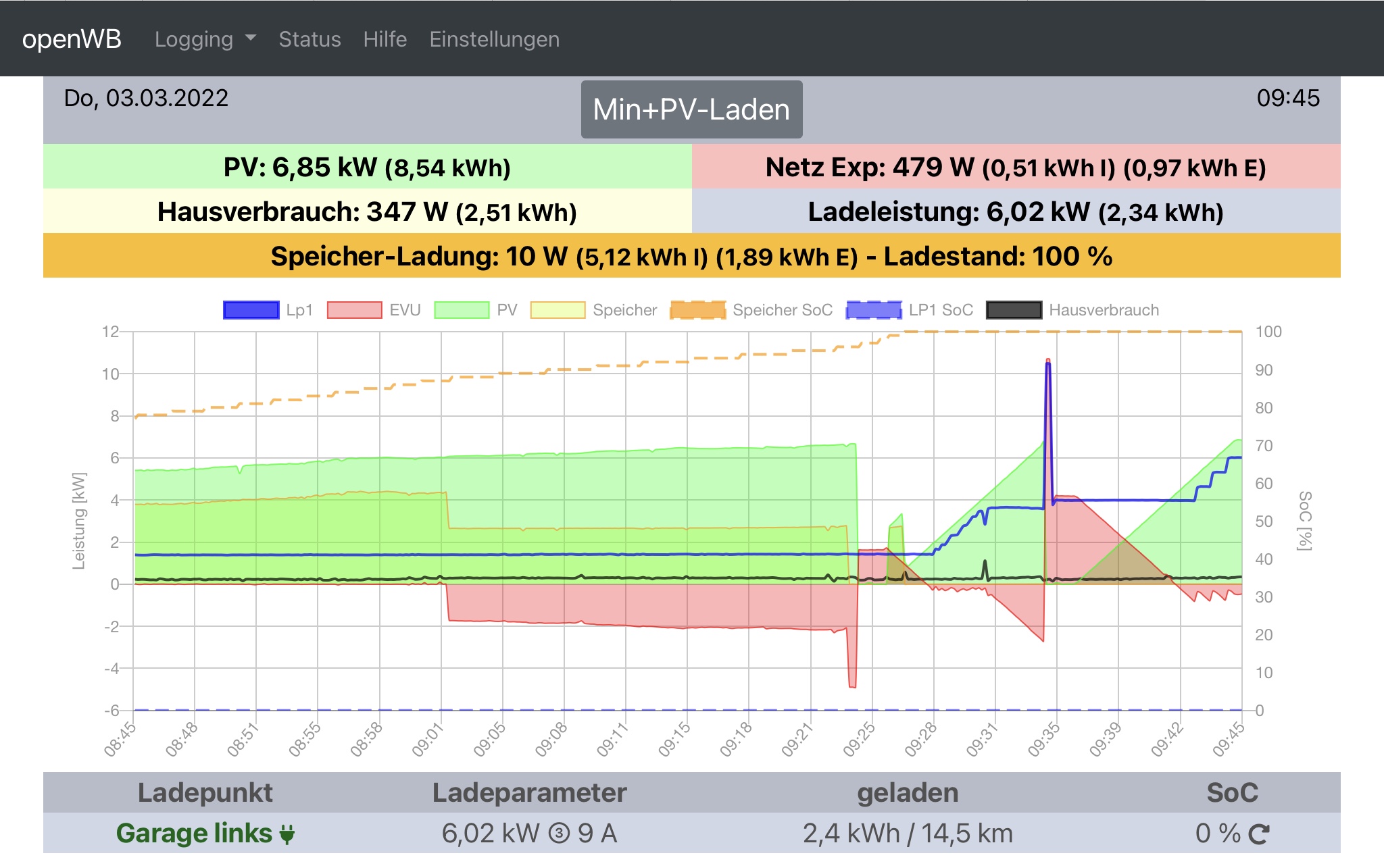 Zur Verdeutlichung habe ich mal einen Screenshot angehängt. Um 9:23 Uhr habe ich auf Min+PV-Laden umgestellt und um 9:34 Uhr hat die WB auf dreiphasiges Laden umgestellt. Auffällig ist auch, dass der Strom nicht aus dem vollen Speicher genommen, sondern aus dem Netz importiert wird. Das ist ja eigentlich auch nicht der Sinn der Sache.