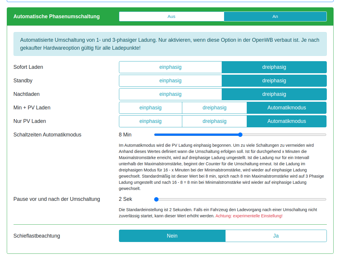 Nun habe ich das erste mal daran geladen und die Umschaltung funktioniert überhaupt nicht. PV Laden steht im Automatikmodus, wie gesagt lade ich an der 1. WB funktioniert auch die Umschaltung sauber. Nehme ich die 2. neue WB dann funktioniert es nicht. Stelle ich auf "einphasig" dann wird Einphasig geladen im PV Modus, stelle ich auf dreiphasig dann wird dreiphasig geladen, im Automatikmodus bleibt die 2. WB permanent Einphasig.