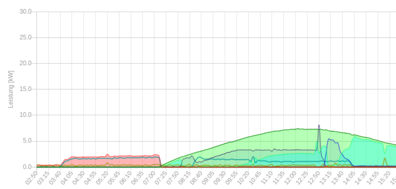 Unten kann man sehen das mehr als genug PV Überschuss vorhanden war um auch 3phasig zu laden, die Ladeleistung war aber permanent bei 3,6kW, Um 13 Uhr habe ich dann mal auf 3phasig umgschaltet und anschließend den 2. LP verwendet, dort hat die Umschaltung sofort geklappt, gegen 14 Uhr war das Auto voll.