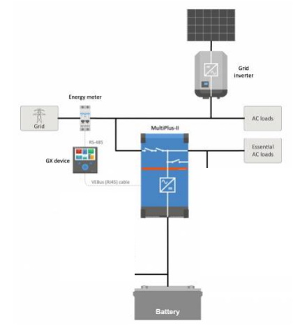 * 1x MPII+ 3000/5000 (integriertes Ladegerät AC/DC) + vorh. AC-PV