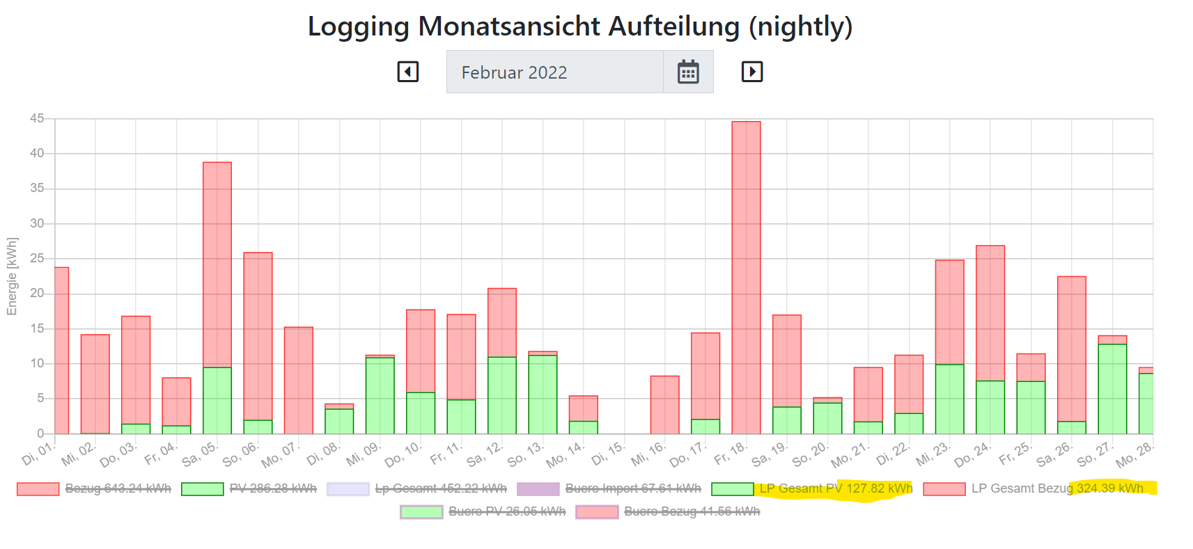 Hier mal ein Screenshot wie das bei mir im Februar aussah, ich hab' EVU und PV Daten der Übersichtlichkeit halber mal aus dem Chart herausgenommen. Die Balken zeigen an woher der Strom für die Ladevorgänge am jeweiligen Tag kamen, ob aus dem Netz oder vom Dach.s1lencer hat geschrieben: Sa Mär 19, 2022 6:05 pm Eine Frage habe ich aber noch an die Experten: Kann ich mir auch direkt angezeigen lassen wieviel ich wirklich aus der pv Anlage "getankt" und wieviel ich aus dem Netz bezogen habe, das habe ich bei openWB bisher nicht gefunden. Also so funktionell wie z. B.: kann man aktuellen Strompreis und die Einspeisevergütung hinterlegen und openWB ermittelt dann die genauen kosten pro kWh?