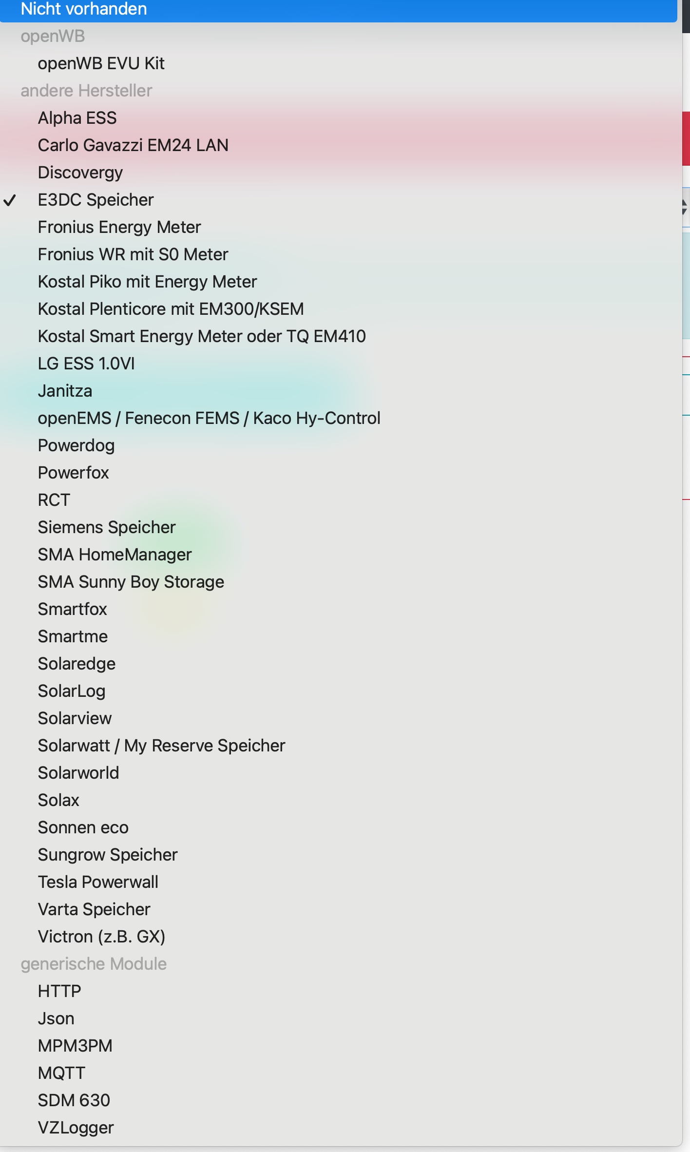Kuck mal bei den vorhandenen EVU-Modulen, ob da ein passendes für Deine Situation vorhanden ist. Bei den generischen weiter unten musst Du selbst programmieren. Beim SDM630 nicht, das ist m.W. das bei openWB-Shop erhältliche EVU-Kit. (3-phasiger per modbus TCP auslesbarer Zweirichtungszähler, quasi der Hardware-Fallback, wenn sonst nichts hilft)juli_august hat geschrieben: Mo Mär 28, 2022 8:35 pm ob und wie ich eventuell meine vorhanden EVU Zählerwerte an die OpenWB übertragen kann?