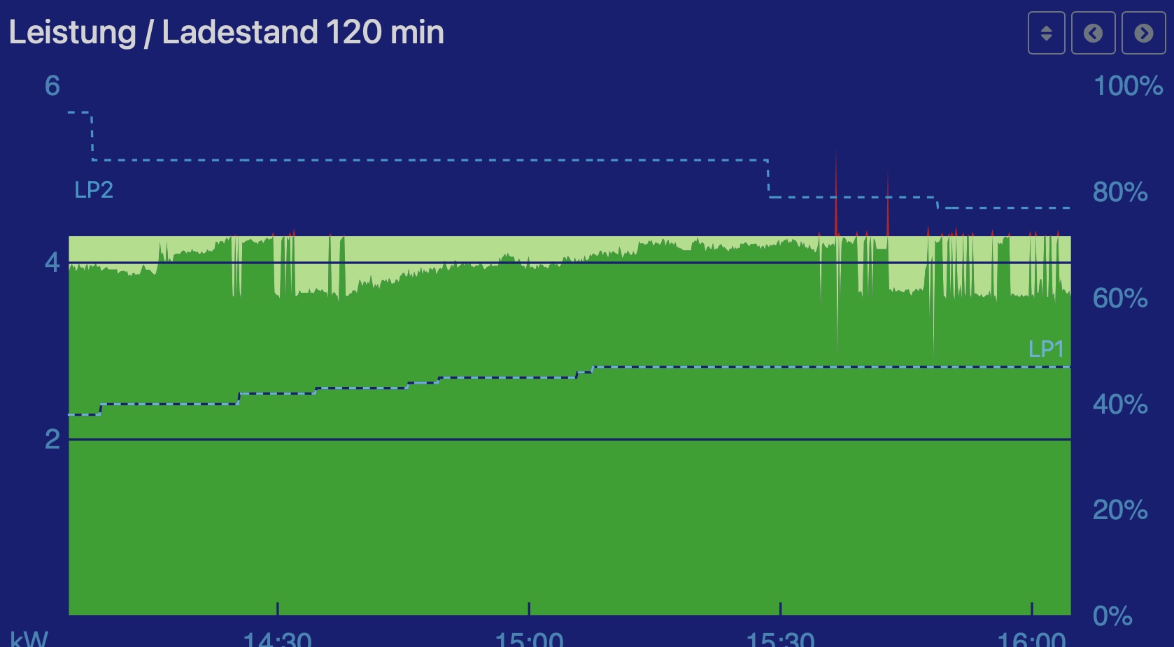 Die Modbus-Connection läuft noch nicht. Das wird später noch nachinstalliert. Daher könnte man es ja erst einmal als 2 getrennte Anlagen sehen. Seltsam finde ich, dass die openWB als PV-Leistung die ganze Zeit 4,3kW anzeigt. Dabei bringt WR1 derzeit ca. 3,3kW. Er war auch auf 4,xkW am Mittag, aber seitdem sinkt die Leistung. Aber die 4,3kW in der openWB sind ganz fix.