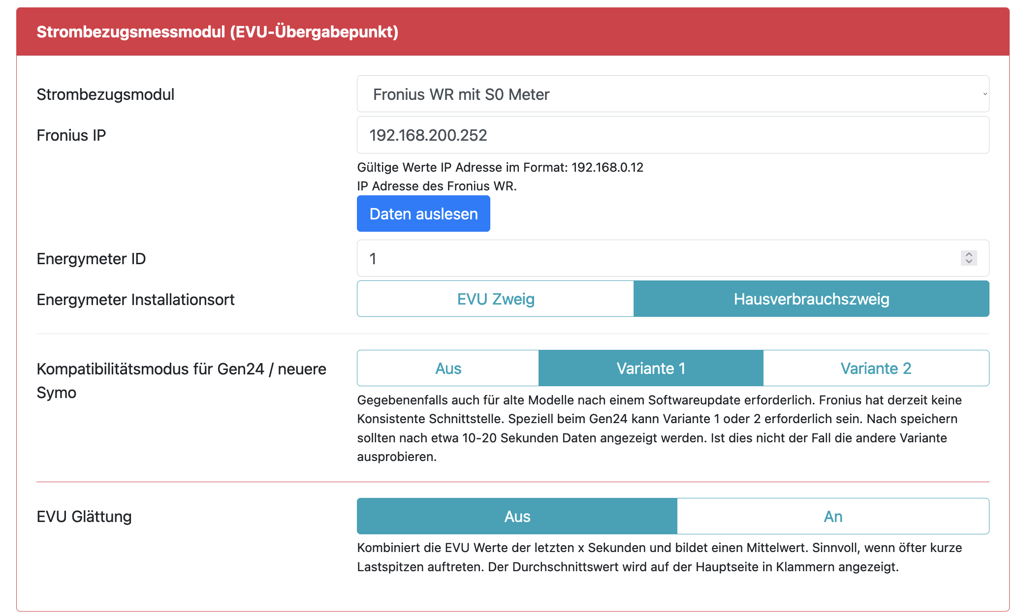 Hast du als Strombezugsmodul ggf keinen SO-Zähler sondern evtl. Den Fronius Energy Meter?