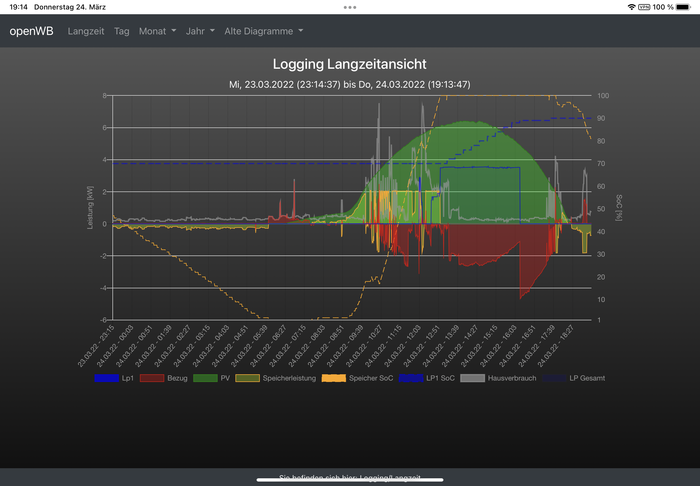 Im Logging Langzeitansicht sieht alles ganz plausibel aus. Wenn ich das Auto (ID3) lade reduziert sich die Einspeisung und wird als negativer Bezug dargestellt.