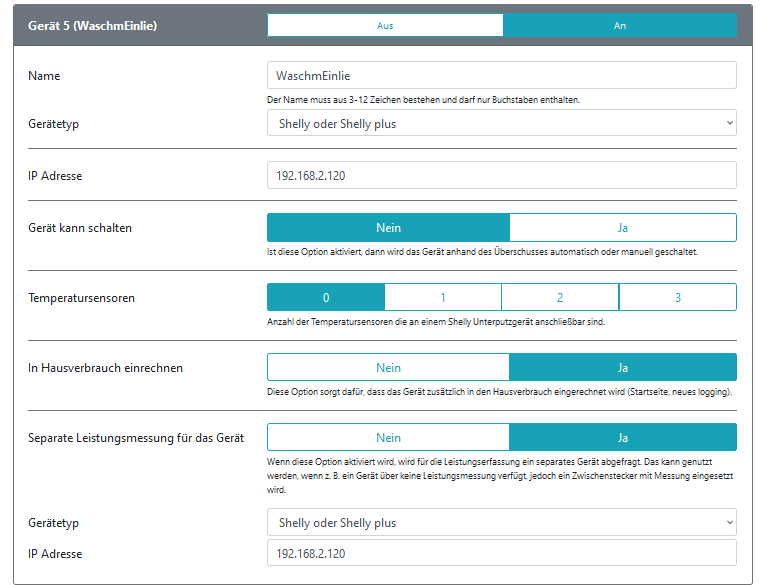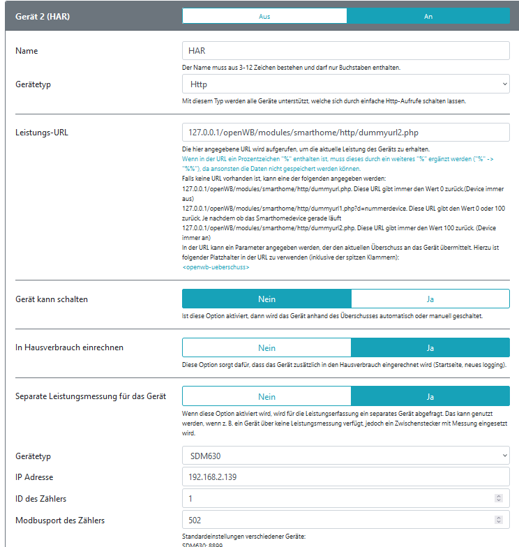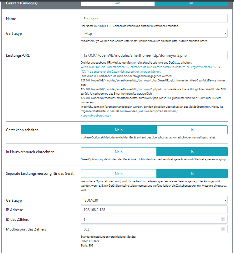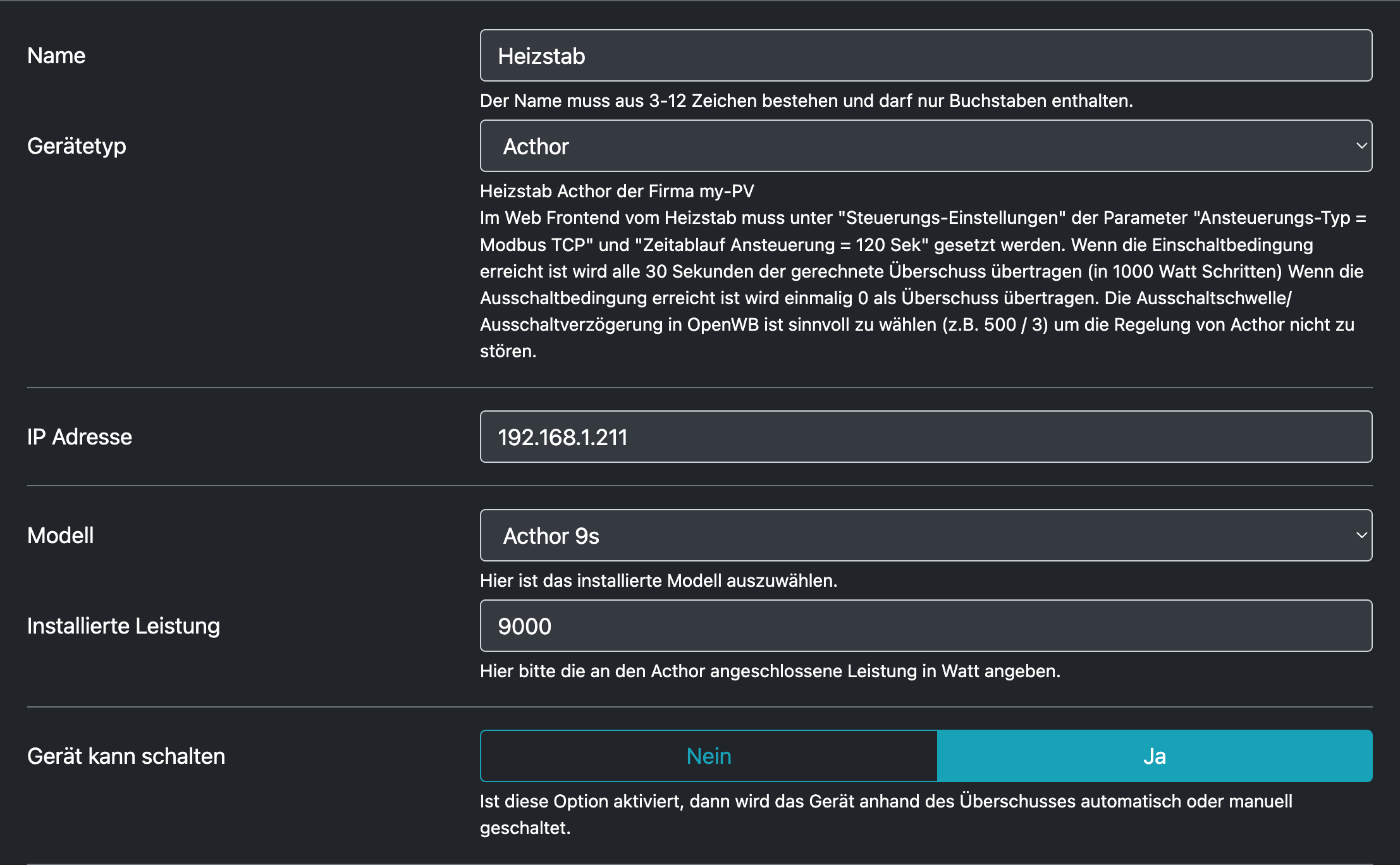 Ich habe die Anleitungen alle gelesen wie man mit Abschaltschwelle anpassen die Berechnung theoretisch beinflussen kann. Es funktioniert aber bei mir einfach nicht. openWB kann das Gerät nicht steuern, nur die Werte auslesen. Auch wenn ich jetzt "Gerät kann schalten" auf "JA" stelle und "bei Autoladen - ausschalten/nicht einschalten" wähle, was ja nach Auskunft hier die Berechnung verändern soll, funktioniert das nicht. Bitte keine weiteren Lektionen über zwei Messstellen (openWB via Tesla Powerwall und Heizstab getrennt). Die Heizstab Messstelle sind ganz "am Ende" der Messkette und kann nur das messen was von openWB übrig gelassen wird.