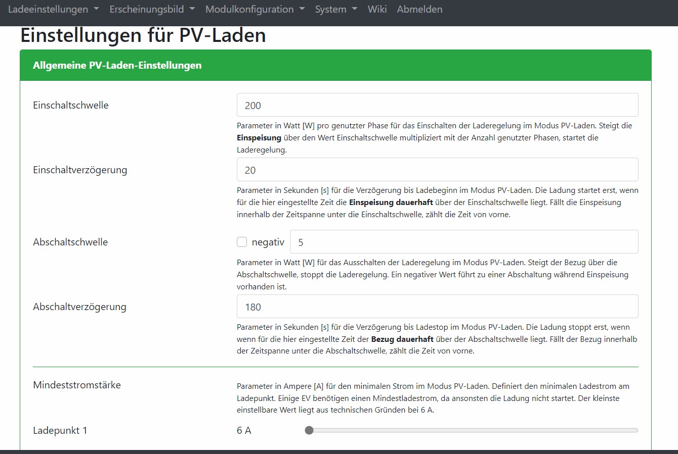 PV Überschuss laden sobald genug überschuss da ist (z.B ab 1,5 KW überschussleistung Ladestart) sobald der übeerschuss zu wenig ist soll er die Ladung stoppen und wieder starten sobald wieder genug vorhanden ist.