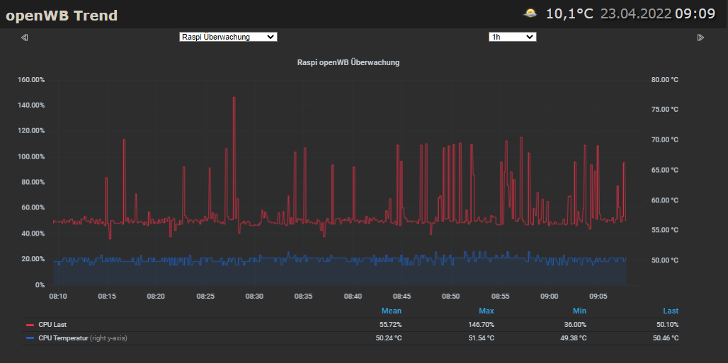 Außerdem ist mir aufgefallen, das in der Überwachung des RASPI immer wieder CPU Last Peaks drin sind, die deutlich über 100% hinaus gehen. Aktuell steht OpenWB im Stop Mode und es wird kein Auto geladen oder ist angesteckt. Lediglich 2 Smarthome 2.0 Geräte (Tasmota und AVM) laufen. Auch ist weder das Digaramm am PC oder das Display an der openWB geöffnet.