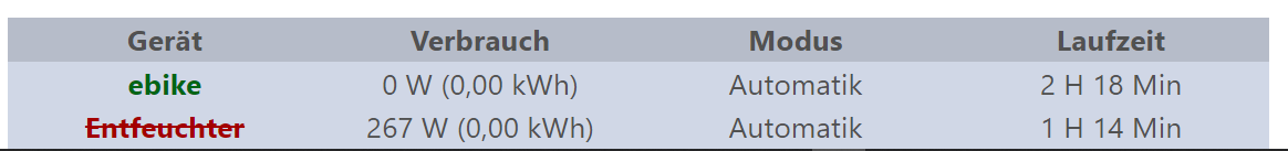 EDIT: Ich habe jetzt in der Konfiguration zu der Steckdose die separate Leistungsmessung ebenfalls aktiviert und die gleichen Daten wie für das Gerät selber eingetragen, was in meinen Augen aber doppelt gemoppelt ist, da das Gerät (die Steckdose) selber ja schon über eine Leistungsmessung verfügt. Genau genommen ist es gar kein externes Gerät, sondern das gleiche. Nun wird beim einschalten auch der Name Grün und ist nicht mehr durchgestrichen.