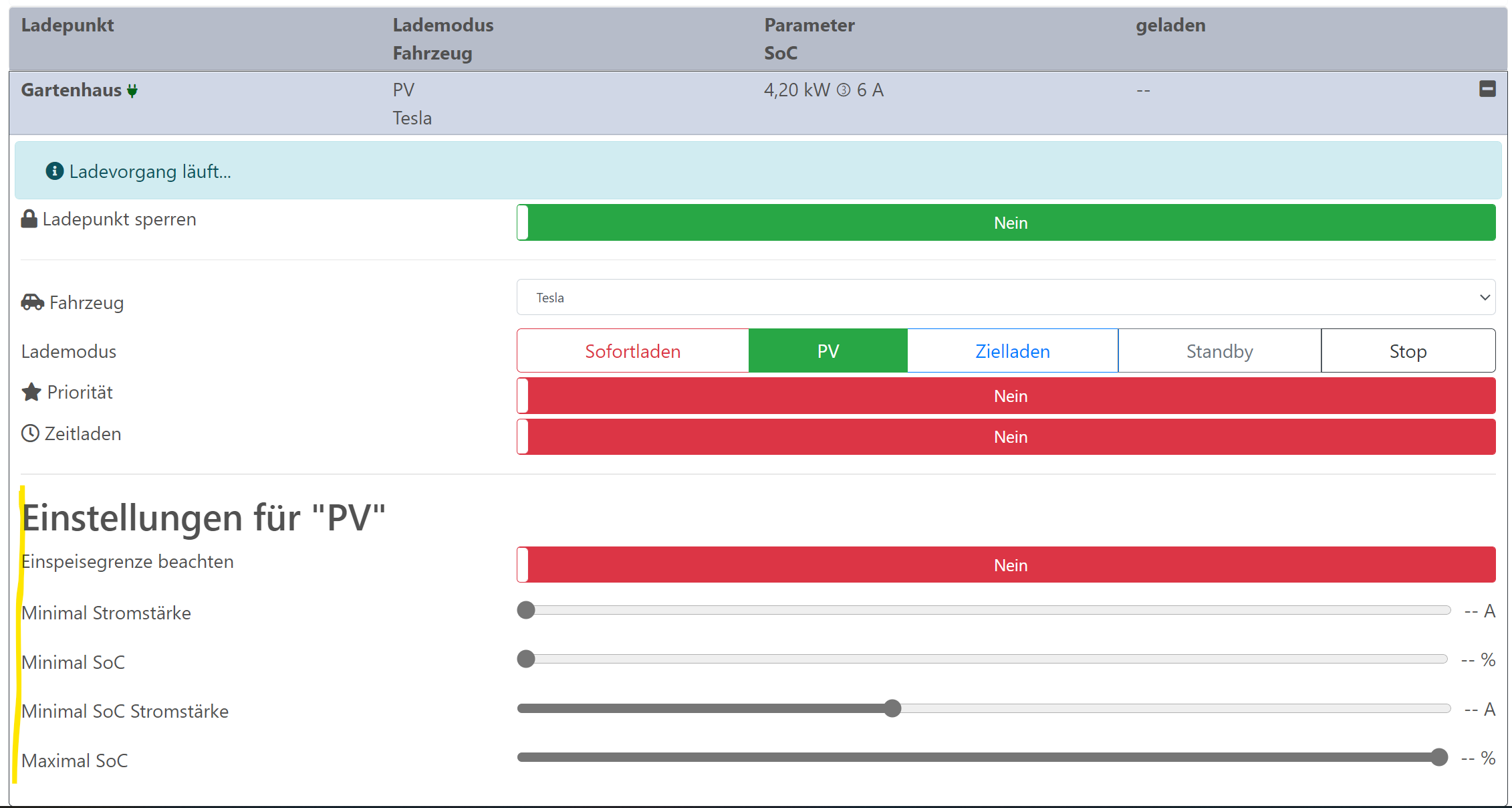 Einige Parameter bei PV-Laden bitte auf Homescreen