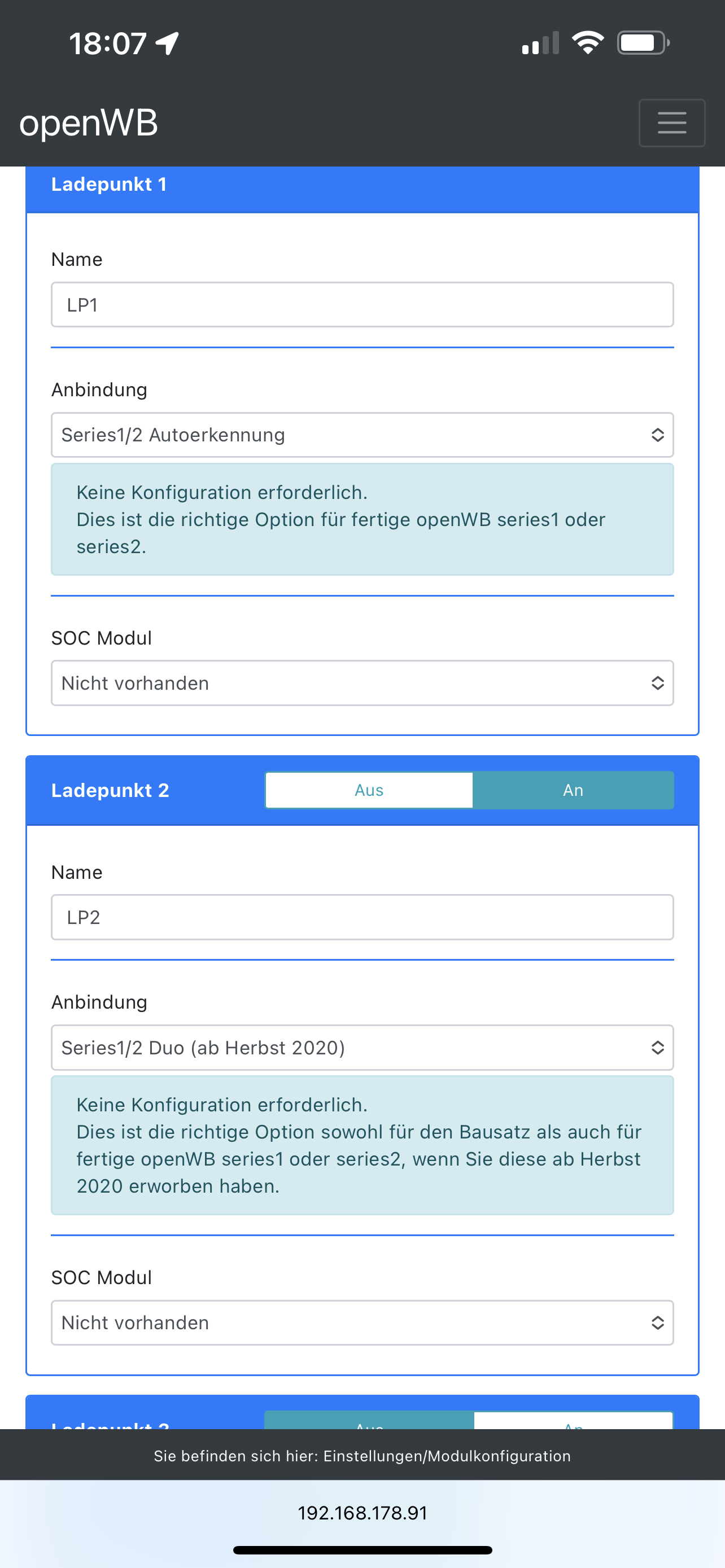 An den Moduleinstellungen habe ich nichts geändert. Spannend ist, dass Modul LP2 eine andere Anbindung als LP1 hat, aber die von LP1 gibt es bei 2 nicht.