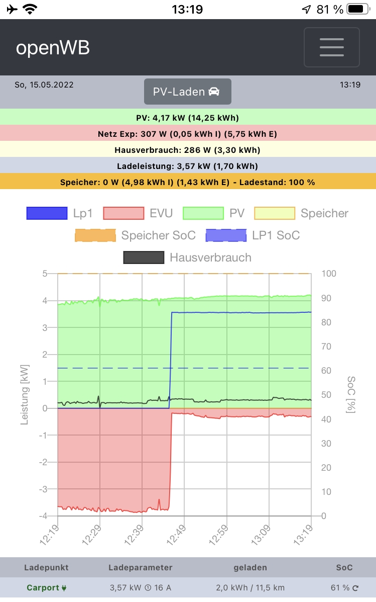 Jetzt werden im openWB Status EVU Daten angezeigt. Ich werde jetzt warten bis die Hausbatterie auf 100% geladen ist, ein Überschuss ins Netz