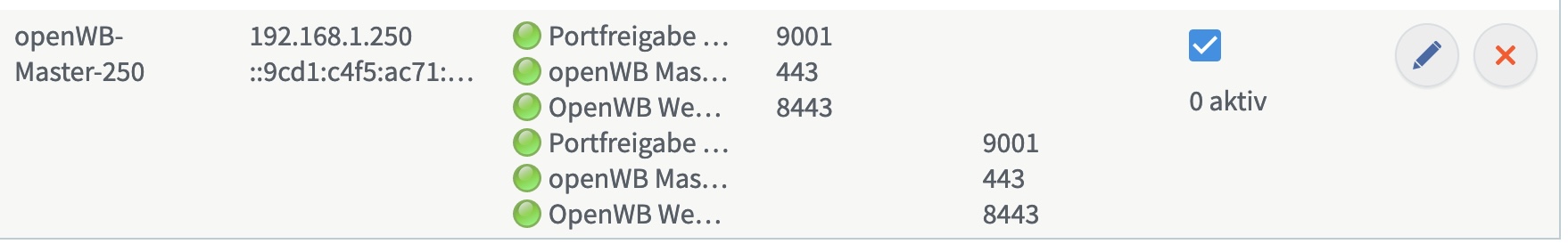 Ist es eine Fritzbox? Wenn die nicht im Gastnetz ist, brauchst du gar keine Freischaltungen, da sich die Geräte untereinander unterhalten dürfen.prysma hat geschrieben: Di Mai 31, 2022 2:17 pmDAS ist definitiv auszuschließen.derNeueDet hat geschrieben: Di Mai 31, 2022 1:25 pm Ist das eine Fritz Box? Du bist aber icht zufällig im Gastnetz mit der openWB?
