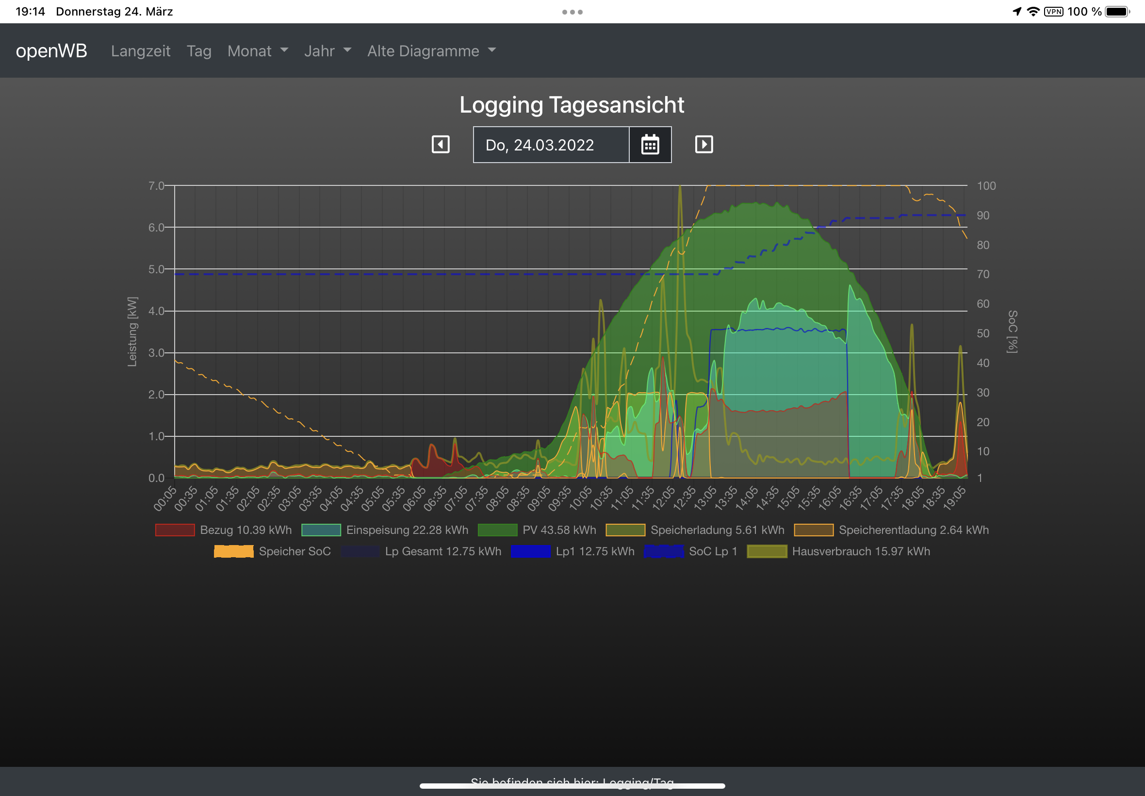 Im Logging Langzeitansicht sieht alles ganz plausibel aus. Wenn ich das Auto (ID3) lade reduziert sich die Einspeisung und wird als negativer Bezug dargestellt.