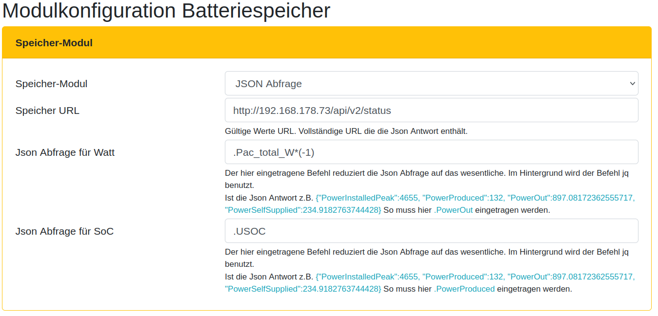 Seit dem Update letzte Woche von 1.9.244 auf 1.9.271 kommen Speicherladeleistung und SOC nicht mehr an. An den oben genannten Einstellungen habe ich nichts geändert. Mit der Modul-Einstellung Sonnen Eco hat es bei mir leider noch nie funktioniert. Meine Batterie (SonnenBatterie 10P mit Software-Version 1.6.10) antwortet aber auch nicht auf die Anfrage "http://xxx.xxx.xxx.xxx/api/v1/status" sondern nur auf "http://xxx.xxx.xxx.xxx/api/v2/status". Deshalb habe ich den komplizierteren Weg über das generische JSON-Modul gewählt.
