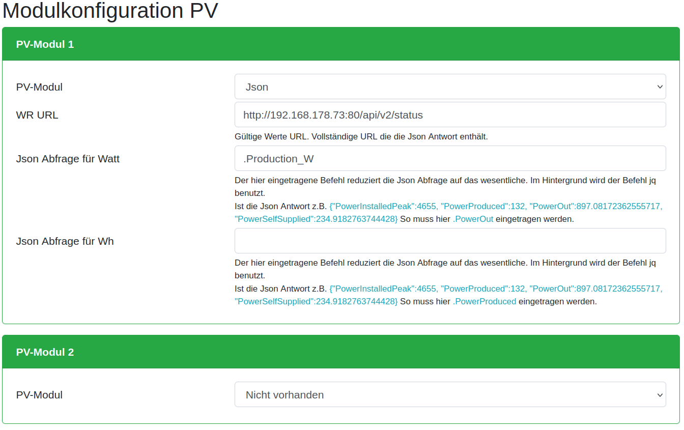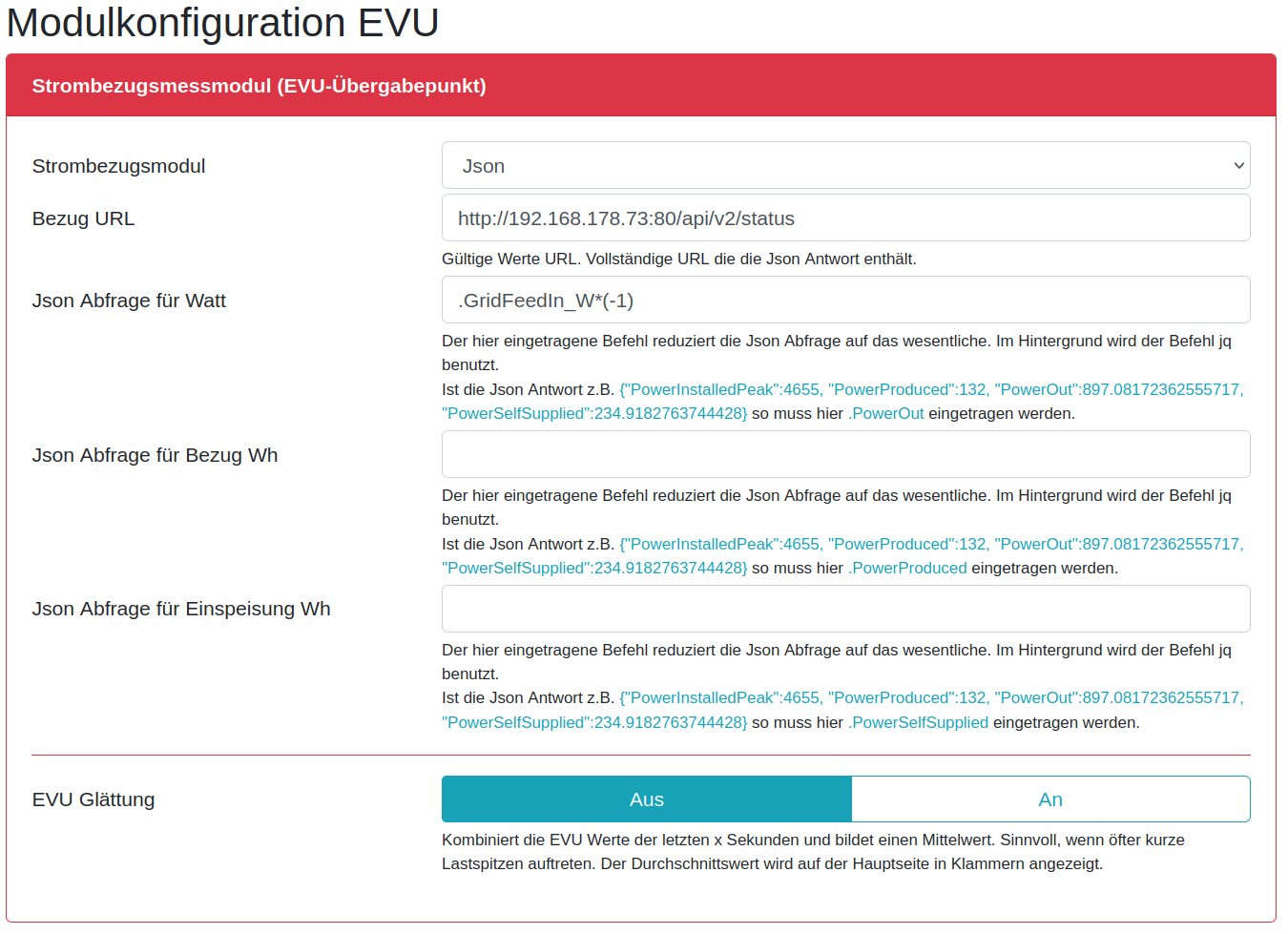 Seit dem Update letzte Woche von 1.9.244 auf 1.9.271 kommen Speicherladeleistung und SOC nicht mehr an. An den oben genannten Einstellungen habe ich nichts geändert. Mit der Modul-Einstellung Sonnen Eco hat es bei mir leider noch nie funktioniert. Meine Batterie (SonnenBatterie 10P mit Software-Version 1.6.10) antwortet aber auch nicht auf die Anfrage "http://xxx.xxx.xxx.xxx/api/v1/status" sondern nur auf "http://xxx.xxx.xxx.xxx/api/v2/status". Deshalb habe ich den komplizierteren Weg über das generische JSON-Modul gewählt.