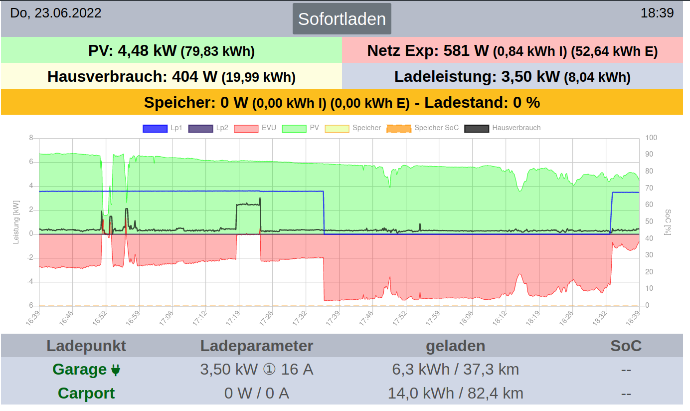 10kWp PV mit SMA Tripower 10000TL-10 (PE11 mit SDM72V2); 2,4kWp mit Solis 2.5 G6 (EE11 mit SDM120). OpenWB Standard+. EVU EM540 an einem Raspi mit Venus OS. BEV Mercedes EQA 250+ (07/2025)