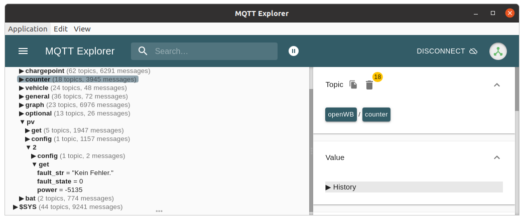 Auch im MQTT-Explorer kann ich keinen Eintrag für den Zähler unter pv finden.