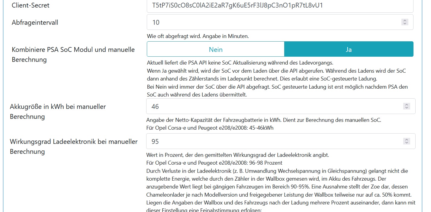 Hab es jetzt mit zwei unterschiedlichen PSA Fahrzeugen (Corsa und 2008) getestet und jeweils wird der SOC zu Ladebeginn aus der APP geholt, aber nicht laufend berechnet. Wenn ich die APP mal öffne und den SOC dort aktualisiere, wird er neue Wert auch in die OpenWB übernommen. Ich hätte aber gerne die manuelle Berechnung.