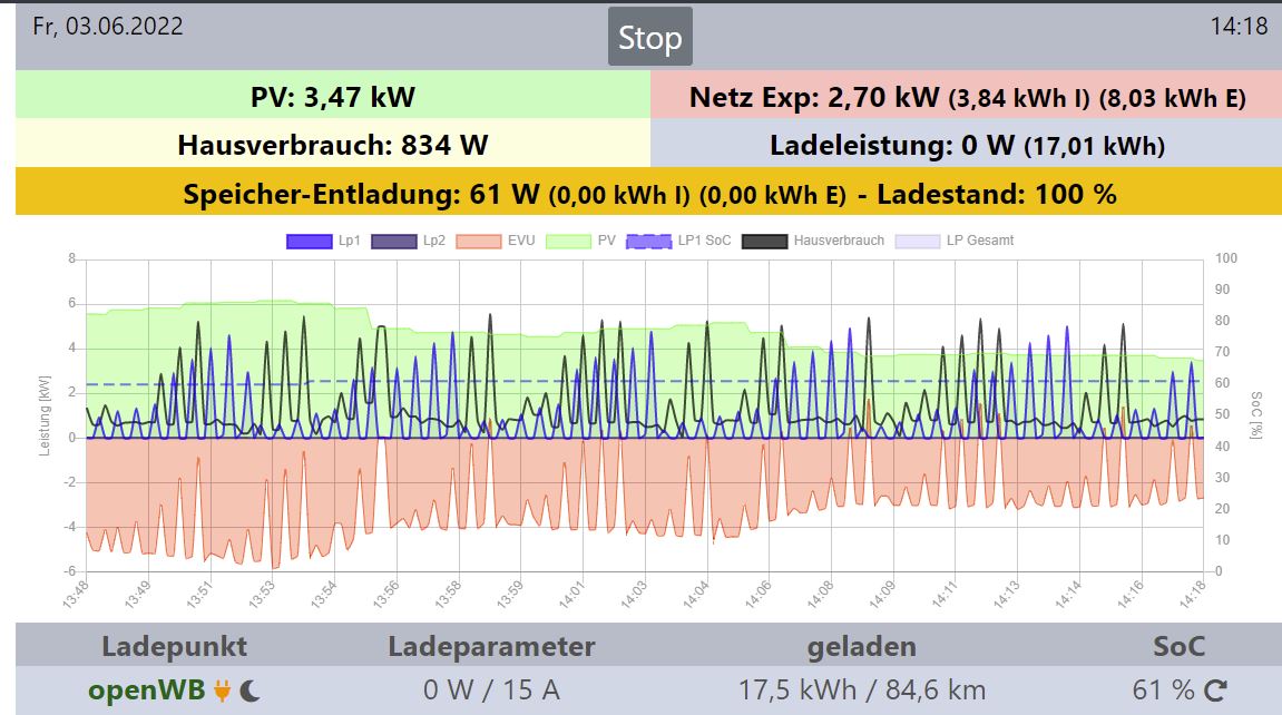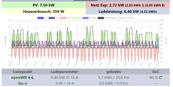 * PV Daten stark pulsierend während des Ladevorgangs. Was es arg wolkig während des Ladevorgangs oder stimmen die gelieferten Daten nicht? Die grüne Fläche sollte die PV-Produktion abbilden, das scheint aber irgendwie nicht zu passen sobald der Ladevorgang gestartet wurde. Welche PV Produktion liefert dein MQTT Setup während des Ladevorgangs, stimmen diese mit der tatsächlichen PV-Produktion überein?