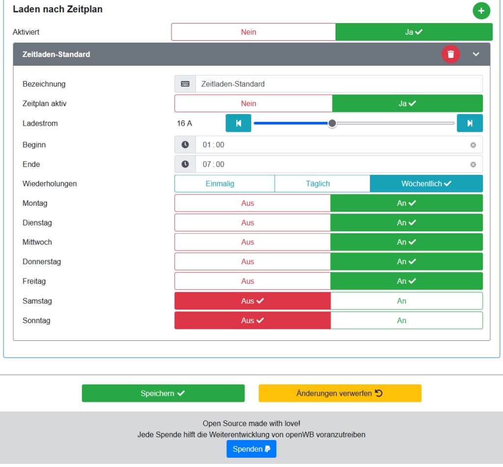 Genau, das von mir angegebene Zeitfenster ist aktuell - zumindest nur mit openWB - nicht einstellbar. Da ich hier aber momentan für das ganze Haus max. 7kW ziehen darf, lade ich mit dem go-e Charger auf 3 Phasen mit 8A und damit knappen 6kW. Insofern benötige ich das gesamte Zeitfenster und nicht erst ab 03:00.