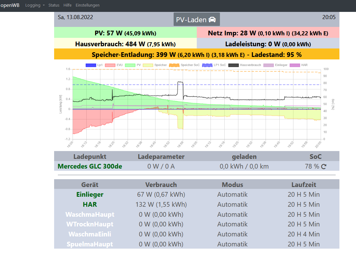 10kWp PV mit SMA Tripower 10000TL-10 (PE11 mit SDM72V2); 2,4kWp mit Solis 2.5 G6 (EE11 mit SDM120). OpenWB Standard+. EVU EM540 an einem Raspi mit Venus OS. BEV Mercedes EQA 250+ (07/2025)