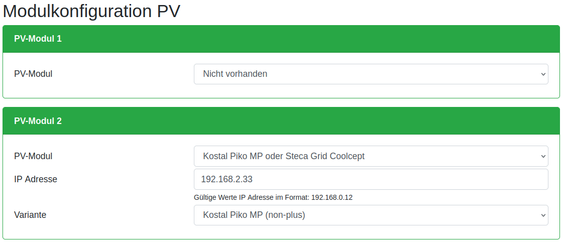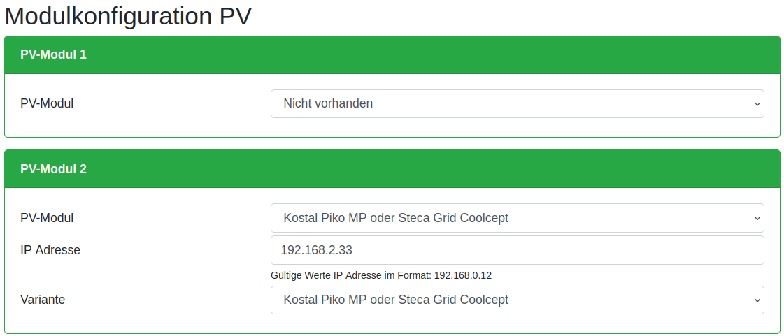 Konfiguriert als PV-Modul 2 "Kostal Piko MP oder Steca Grid Coolcept":