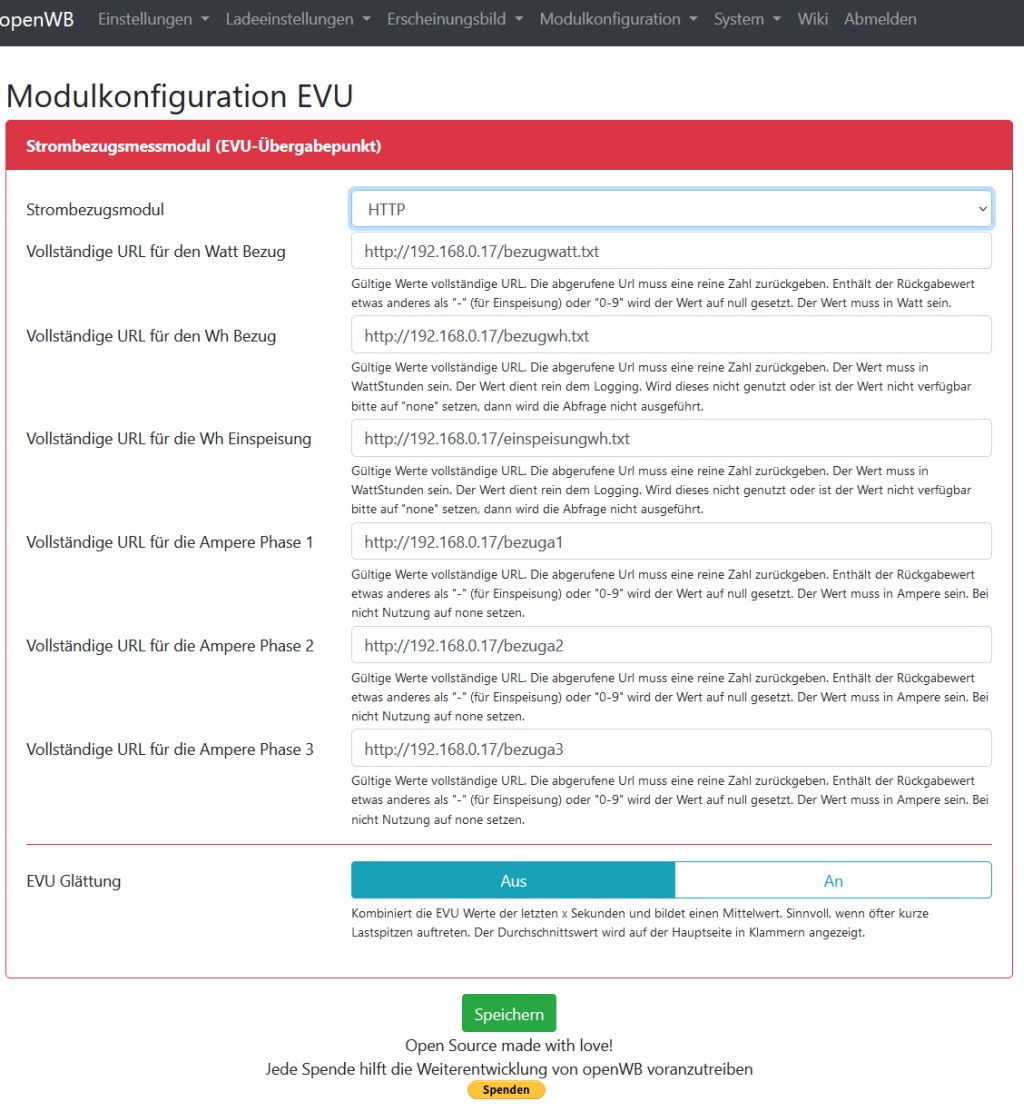 In der Modulkonfiguration EVU habe ich eine URL für den Watt Bezug angegeben. Dort wird eine Zahl in Watt ausgegeben. Negative Zahlen für die Einspeisung und positive Zahlen für den Netzbezug. Die aktuellen Werte PV, Hausverbrauch und Bezug werden im Graphen auch korrekt angezeigt.