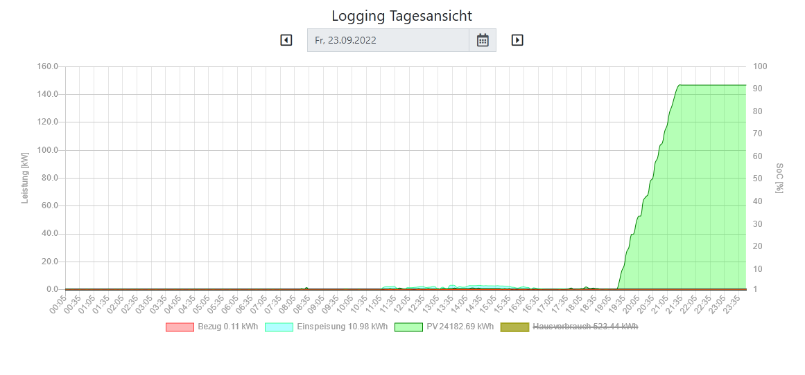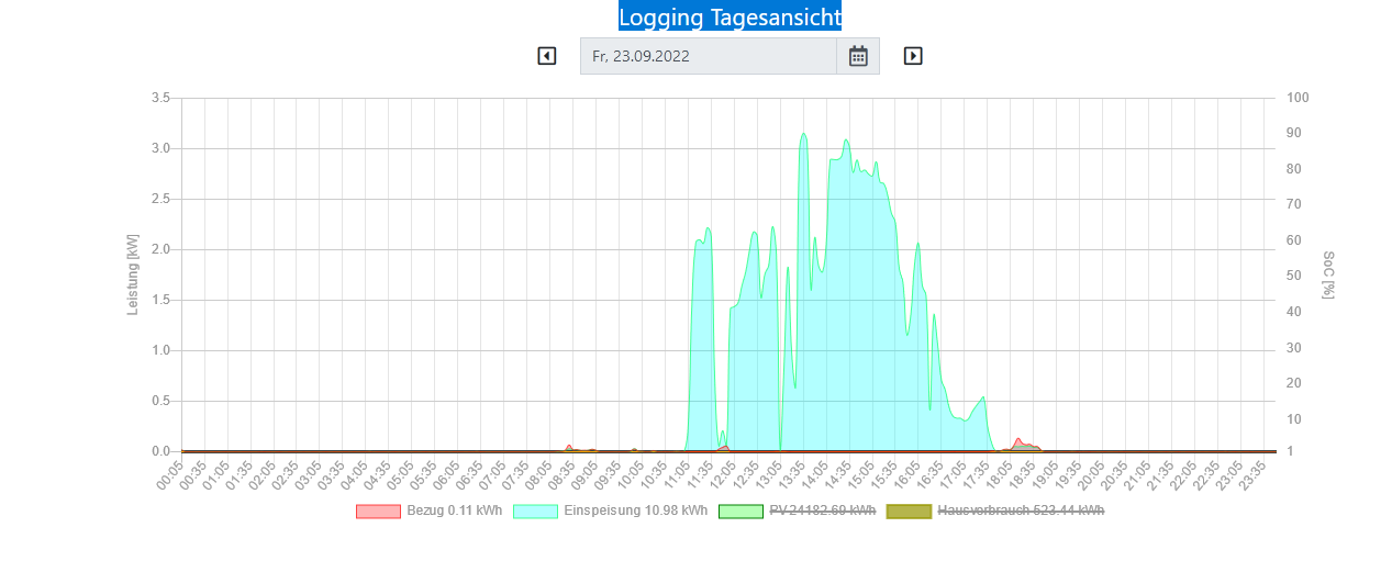 Solange beide Wechselrichter tagsüber aktiv sind, werden die Ertragsdaten in WR1 und WR2 korrekt protokolliert. Sobald abends der alte Piko in den Schlafmodus geht, findet sich im Log eine Fehlermeldung. Das wäre allein kein Problem, allerdings wird nun von diesem Moment an die aktuelle Leistung des Hybridwechselrichters (der ist aktiv, weil er Strom aus der Batterie einspeist) alle paar Sekunden als Wert für die Leistung des schlafenden WR Piko_alt verwendet, und zwar nicht als aktueller Wert, sondern jeweils zum vorigen Wert aufsummiert. Daher wird als Leistung des Piko_alt am frühen Morgen ein Wert von einigen hundert kW dargestellt und in der Grafik entsprechend angezeigt. Damit ist die Grafik nicht mehr verwendbar. Der Gesamtertrag steht deshalb jetzt bei 253.190.182.023.105,840 kWh (wäre super, wenn das stimmen würde, dann könnte ich halb Europa mit Strom versorgen