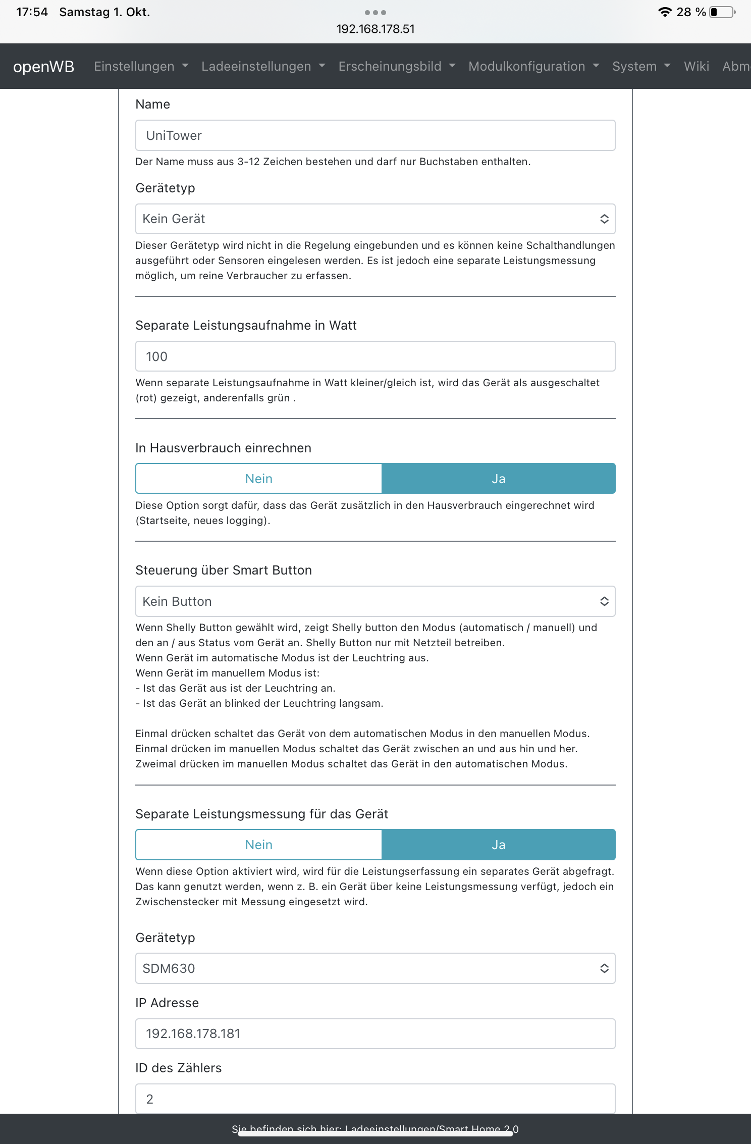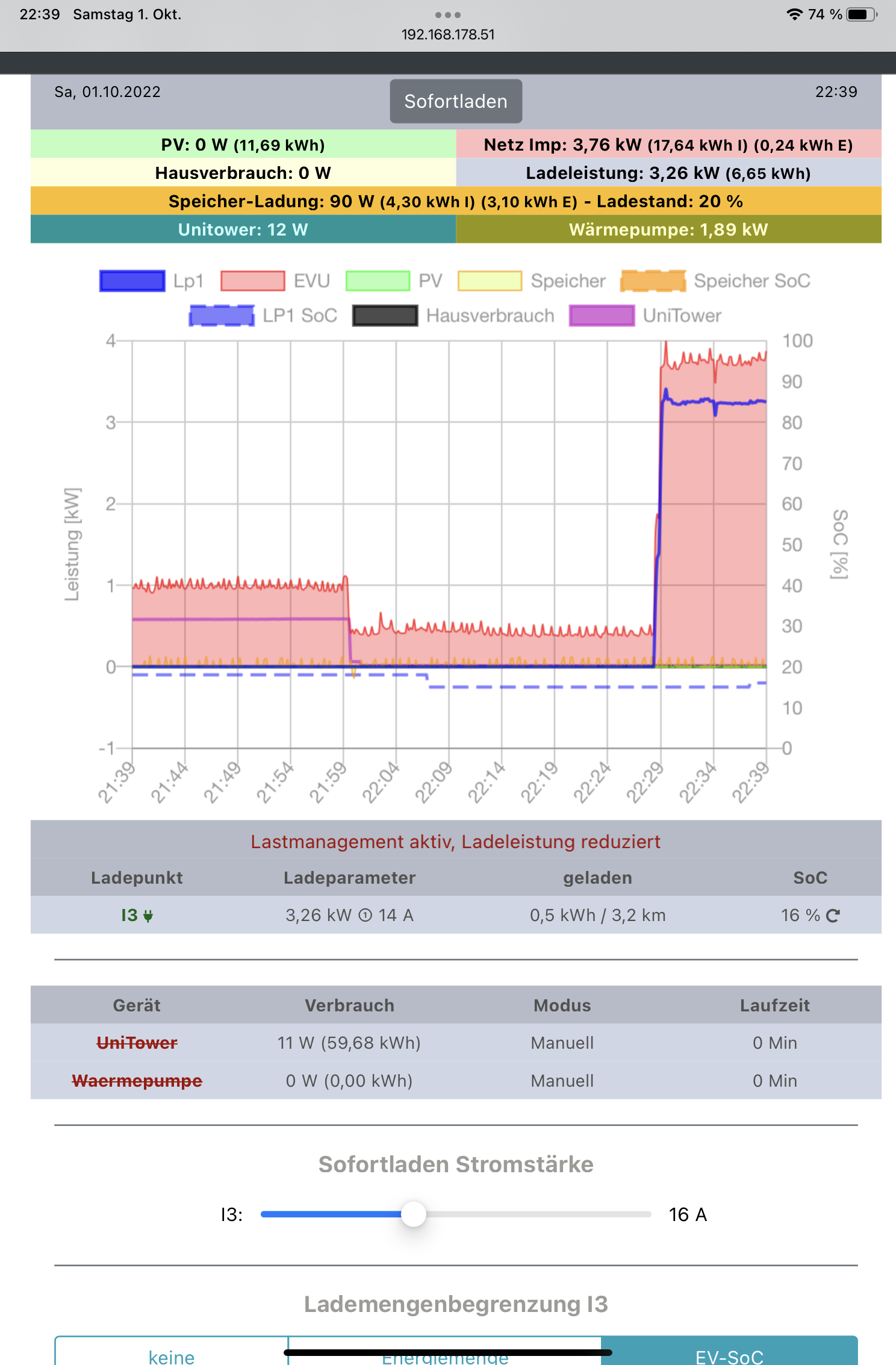 Hier die OpenWB Oberfläche. Der 120er scheint irgendwie nicht korrekt eingebunden zu sein mit 0 Watt und warum ist der UniTower mit über 550watt rot anstatt grün gekennzeichnet