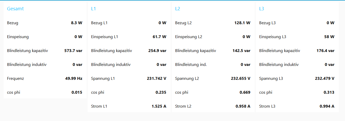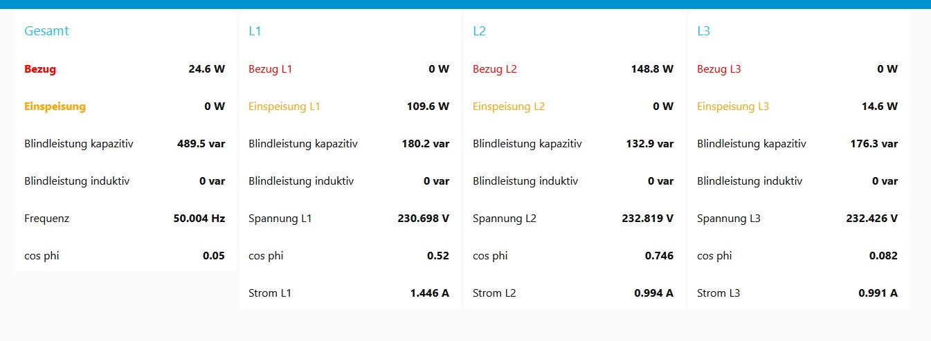 Edit 02.12.2021, kleine Korrekturen und MQTT auf 10s Intervall geändert. Blindleistung: positiv=kapazitiv, negativ=induktiv