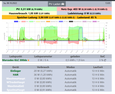 Elchkopp hat geschrieben: Sa Okt 08, 2022 7:30 am Ehrlich gesagt fand ich es bisher eigentlich ganz gut, dass die OpenWB bei "PV" die (vermeintlich) tatsächlich auf dem Dach erzeugte Tagessumme der kWh angezeigt hat und eben nicht das, was in den Speicher geflossen ist (Speicher-Ladung "I" in der OpenWB), nicht zur Tagesproduktion dazugezählt hat - so wie Solar Edge das macht. Ich finde es halt interessant zu sehen, was wirklich "auf dem Dach" erzeugt wurde - unabhängig davon, ob es Verbraucht, in den Speicher oder ins Netz geflossen ist.
