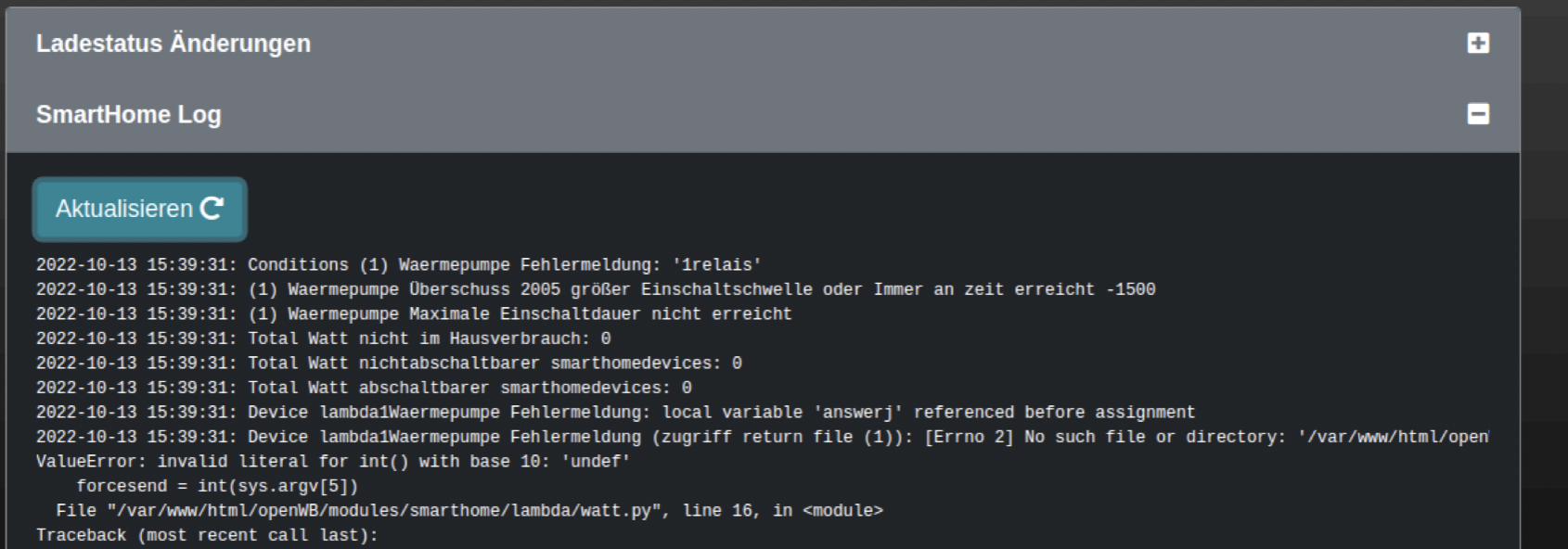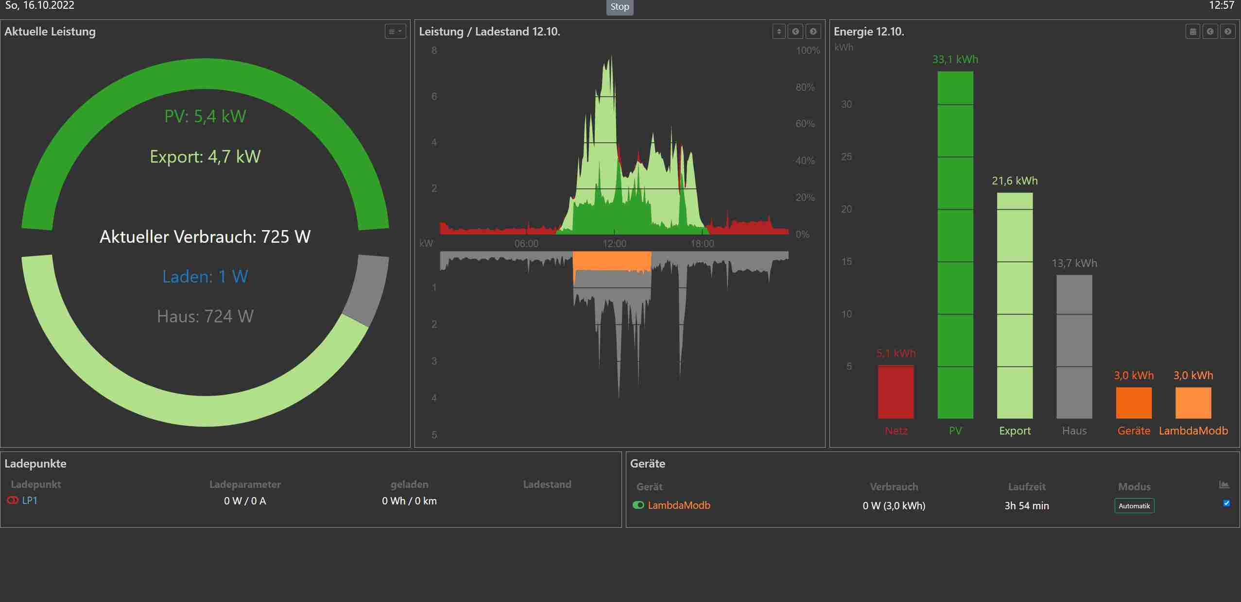(Nachtrag: es gab erfreulicherweise einige Zeit genug Sonne, so dass trotz laufendem Speicher etwa 2 kW ins Netz eingespeist wurden. Nach 15 Minuten ist die Lambda aktiv geworden und hat den Zielwert der Temperaturen im Puffer für die Warmwasserbereitung 5 Grad erhöht. Ein paar Grad hat es gebracht, bis der Überschuss lange genug gering war und sie abgeschaltet hat)